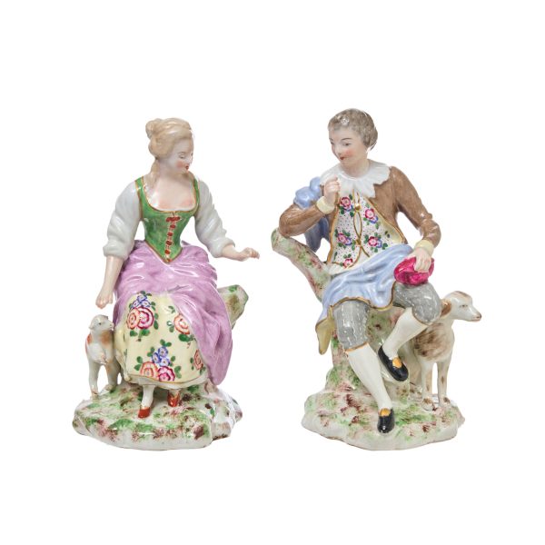 Pareja diociochesca con animales en porcelana alemana esmaltada, c.1900. Marcas en la base.