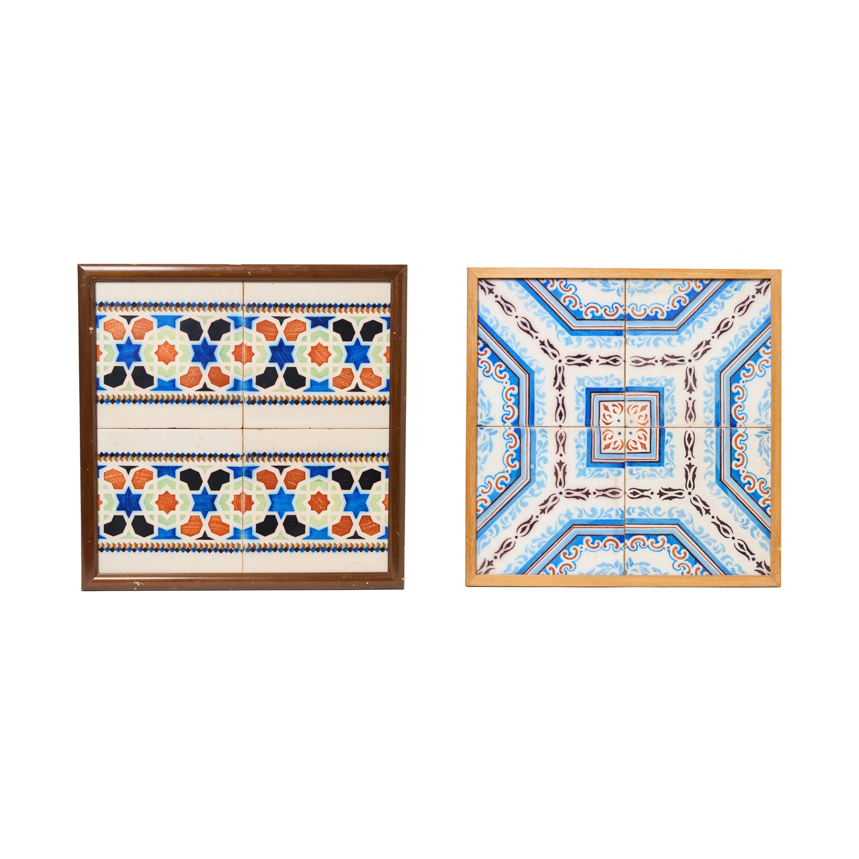 Pareja de plafones de cuatro azulejos en cerámica esmaltada, s.XX. Uno con decoraciones geométricas de tonalidades azul, roja y negra. Otro con decoraciones geométricas de tonalidades roja, verde, azul y negra. Enmarcados.