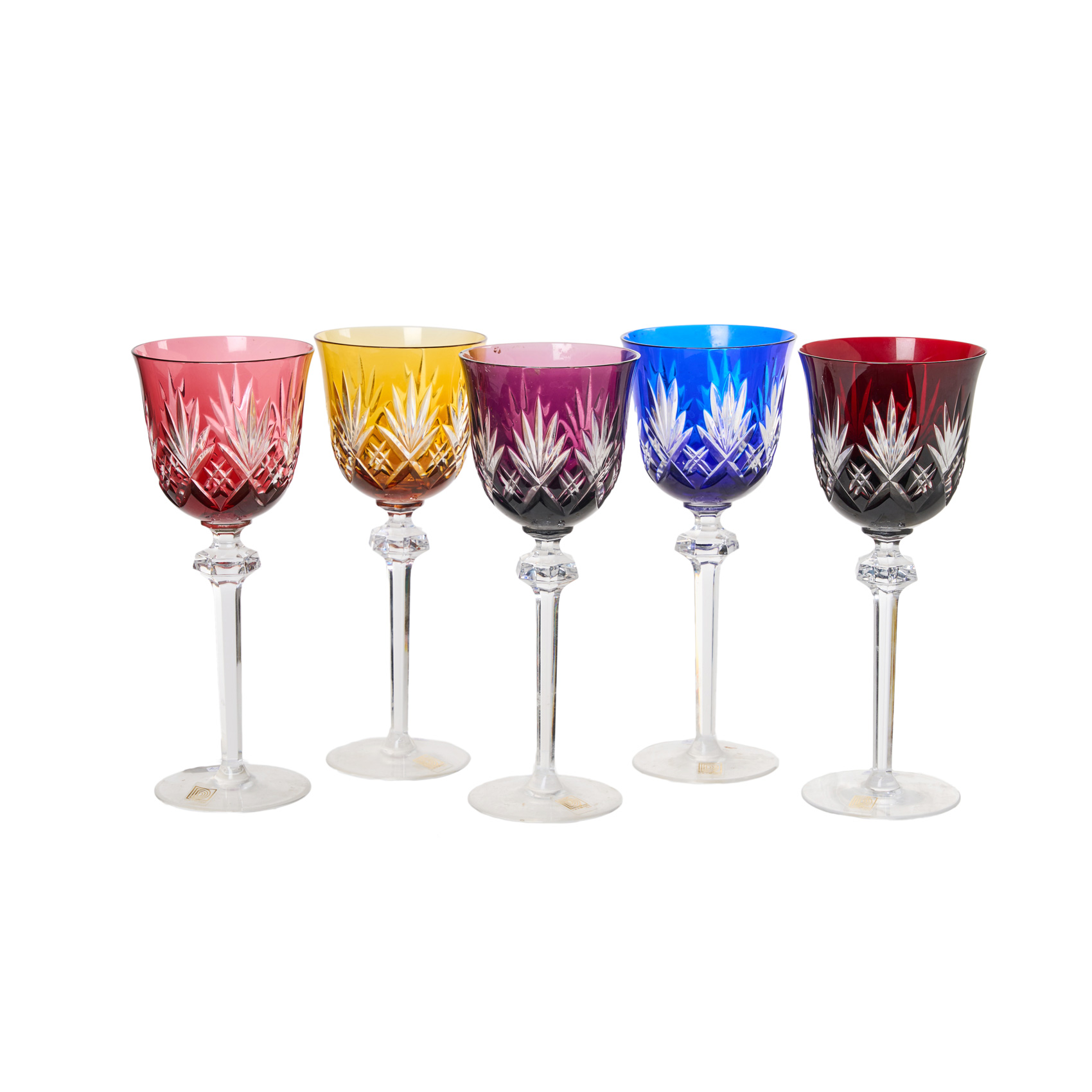 Juego de cinco copas de vino en cristal tallado y doblado en diferentes tonalidades con decoración de motivos vegetales, s.XX. Etiquetas de origen.