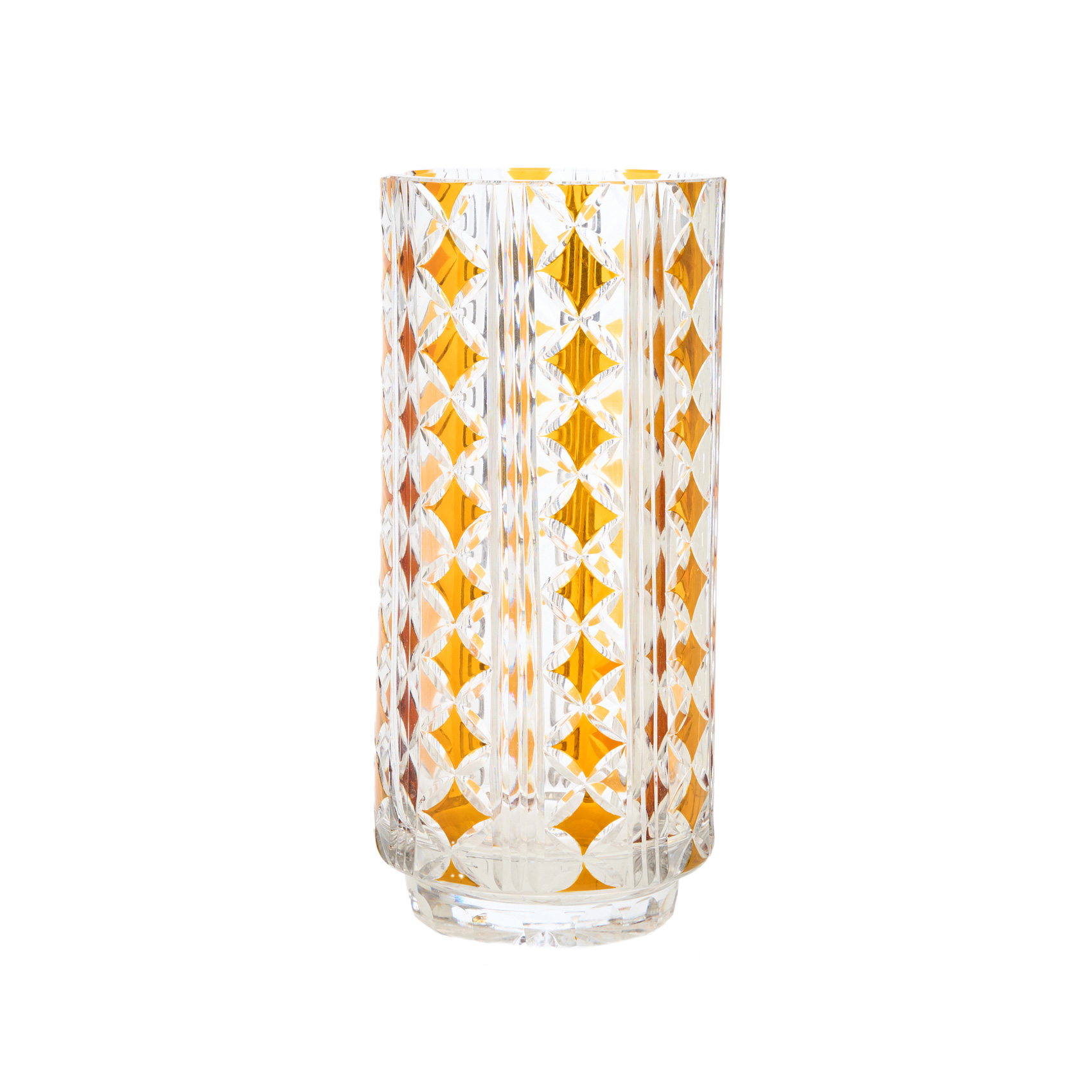 Jarrón búcaro en cristal tallado de tonalidad translúcida y ámbar con decoración de motivos geométricos, s.XX.