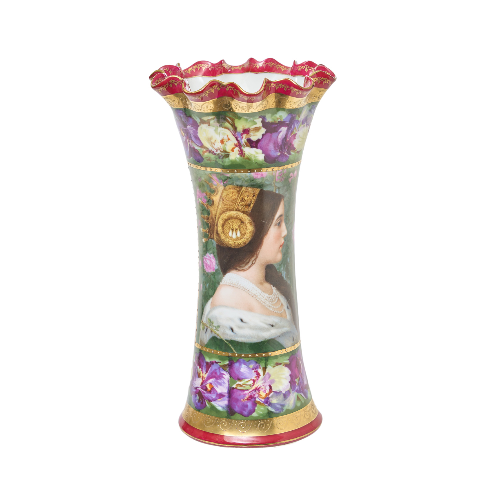 Violetero con perímetro ondulado en porcelana austríaca esmaltada con decoraciones florales, de dama en cartela y realces en dorado, ppios. del s.XX.