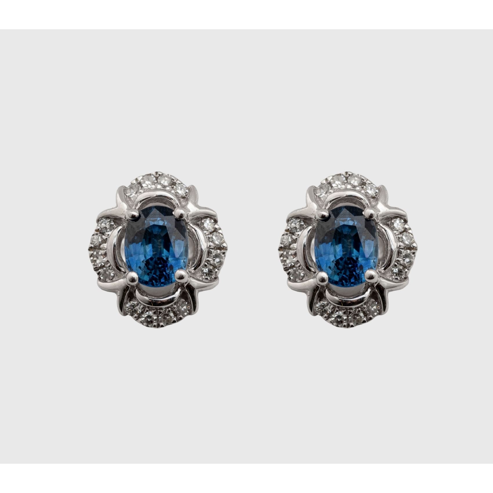 Pendientes en oro blanco con zafiro azul talla oval orlado por ondas de pavé de diamantes talla brillante.