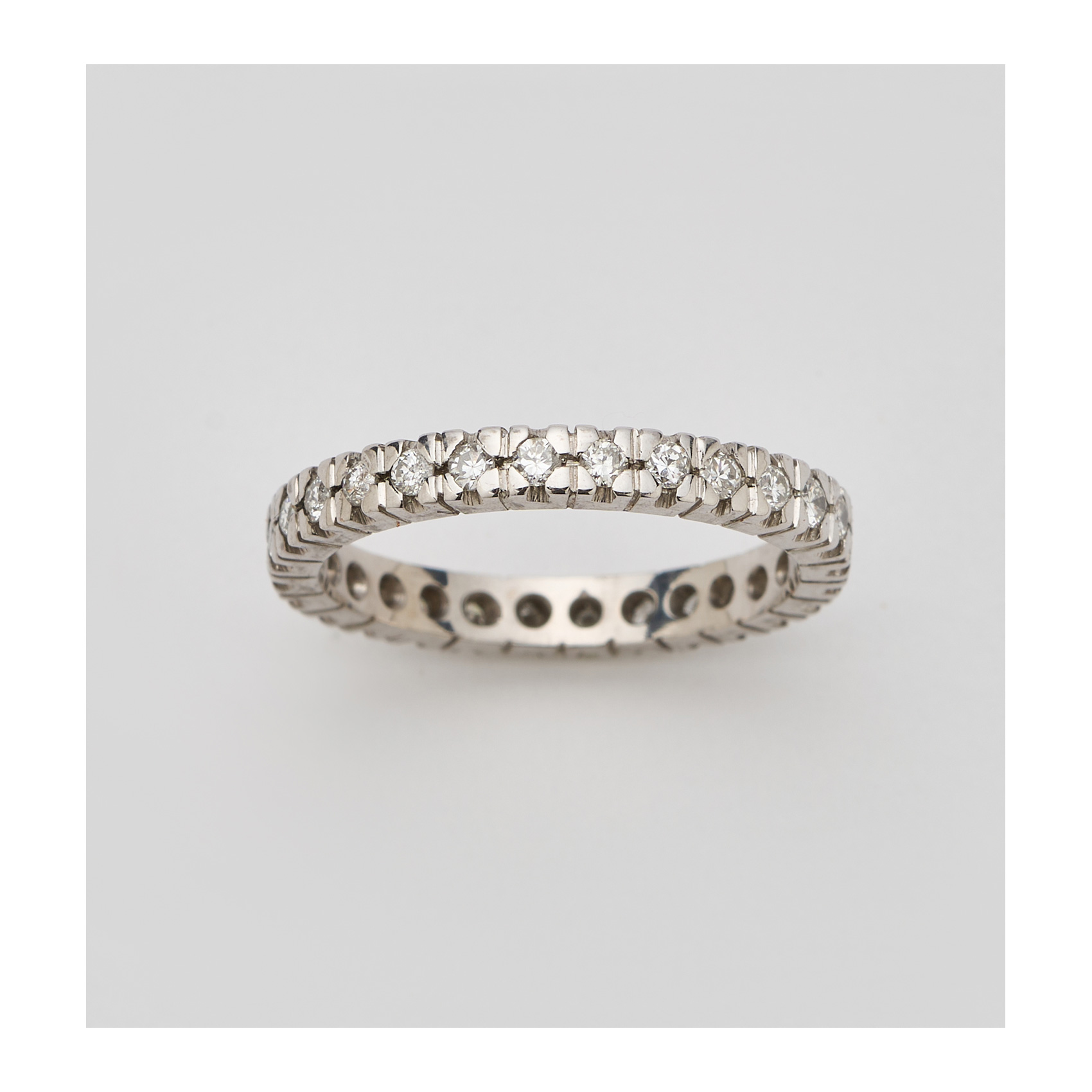 Sortija en oro blanco con diamantes talla brillante engastados en garras.