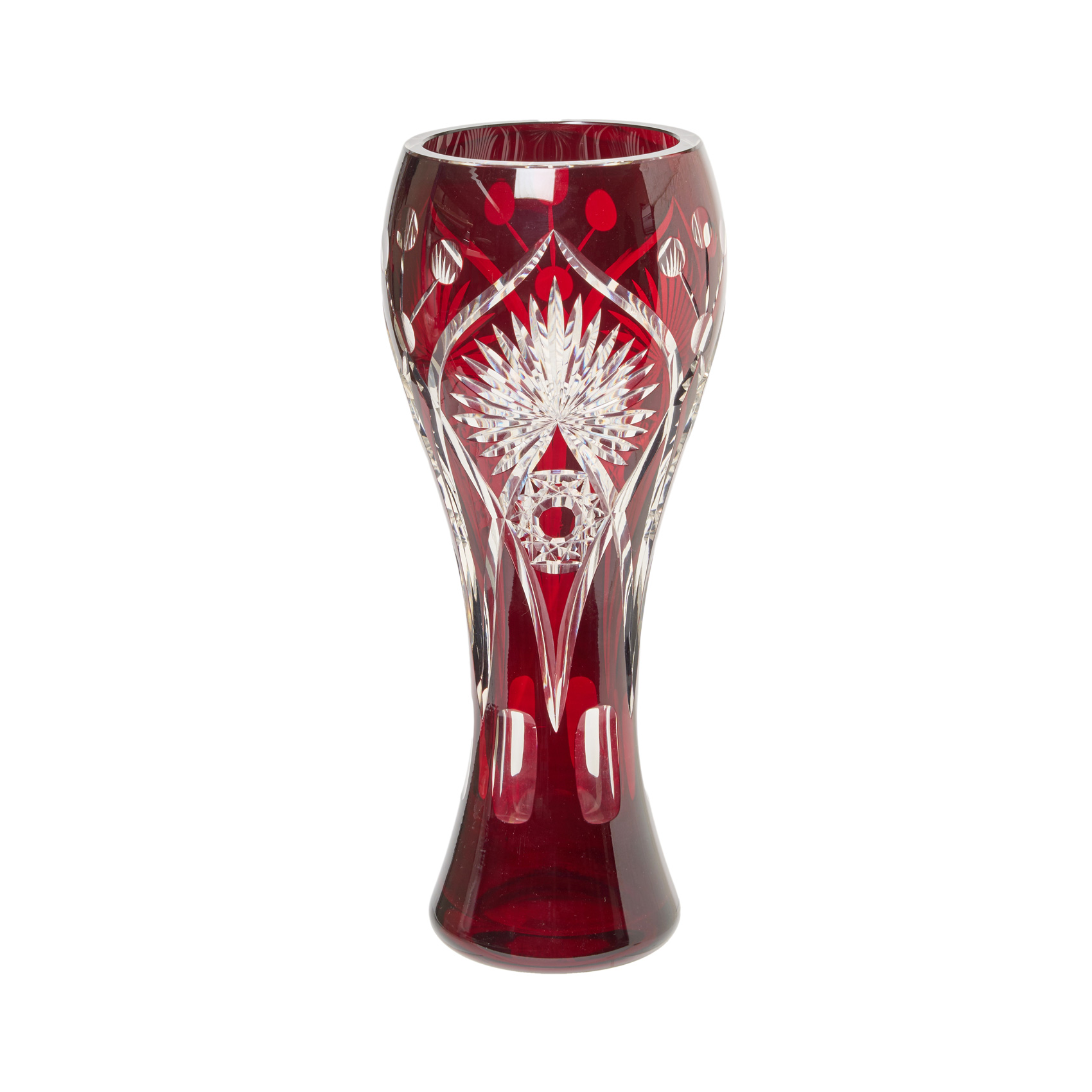 Jarrón en cristal tallado y doblado de tonalidad rojo rubí con decoración de motivos geométricos, mediados del s.XX.