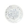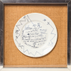 Plato conmemorativo en cerámica esmaltada de la boda del crítico y profesor de arte Rafael Santos Torroella (1914-2002) con María Teresa Bermejo Hernández (1919-2013), en la cual Joan Miró ejerció como padrino. Nombre de la madrina, Anita Solà d’Imbert, y nombres de los padrinos, Sixte Illescas, Victor Mª d’Imbert y Joan Prats, esmaltados en el asiento. Firmado y fechado el 18 de febrero de 1950 en el asiento. Numerado 16/24 al dorso. Bibliografía: Reproducido en el libro «Col·lecció Riera: anys 40: Centre d’Art Santa Mònica, del 22 de setembre al 31 de desembre de 1994», Pág. 75. Edita Generalitat de Catalunya. Departament de Cultura. Barcelona, 1994. En formato digital.