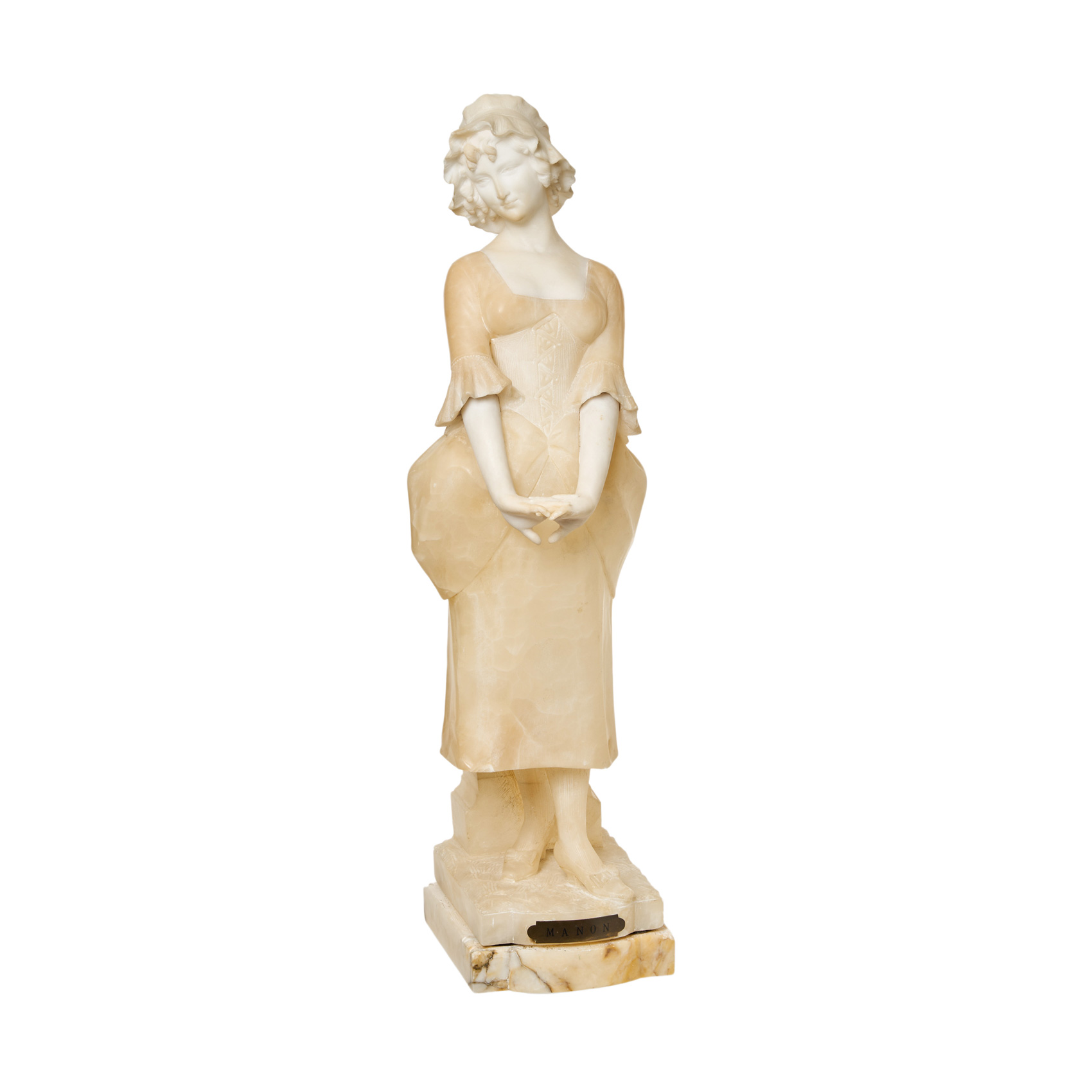 Escultura en alabastro tallado sobre peana en mármol blanco veteado. Firmada ilegible.