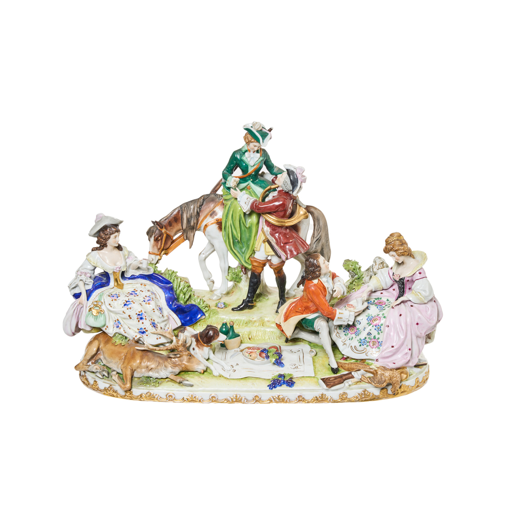 Día de pícnic. Grupo en porcelana alemana esmaltada, ppios. del s.XX. Firmada. Marcas en la base.