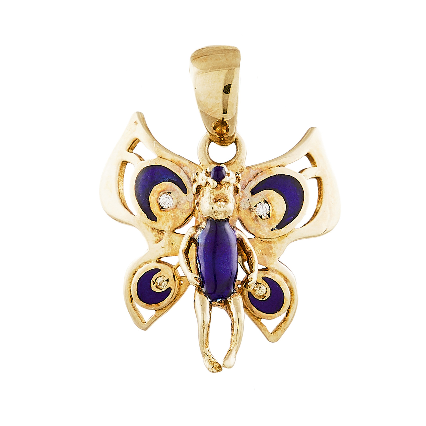 Colgante diseño mariposa en oro y esmalte de tonalidad azul con diamantes talla brillante engastados en chatón.