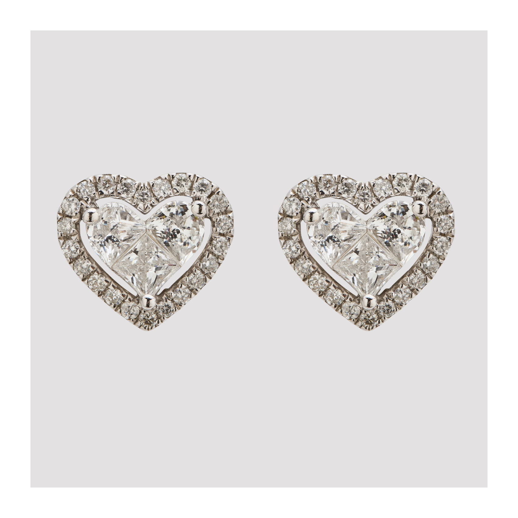 Pendientes diseño corazón en oro blanco con diamantes tallas brillante, princesa y trillón engastados en garras e invisible.