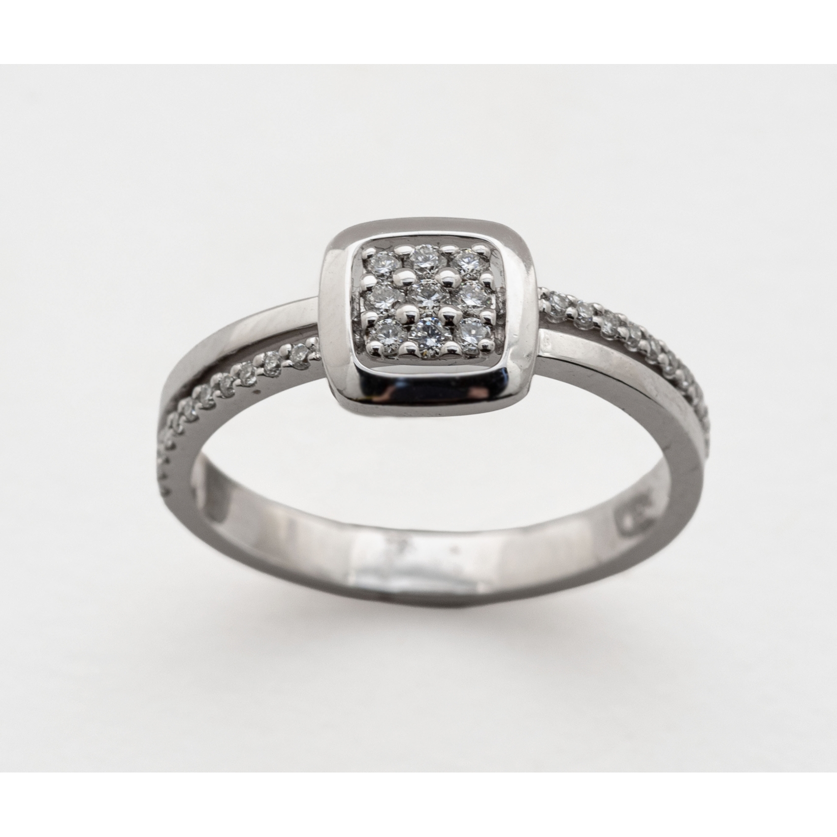 Sortija en oro blanco con centro cuadrado y brazos de diamantes talla brillante.
