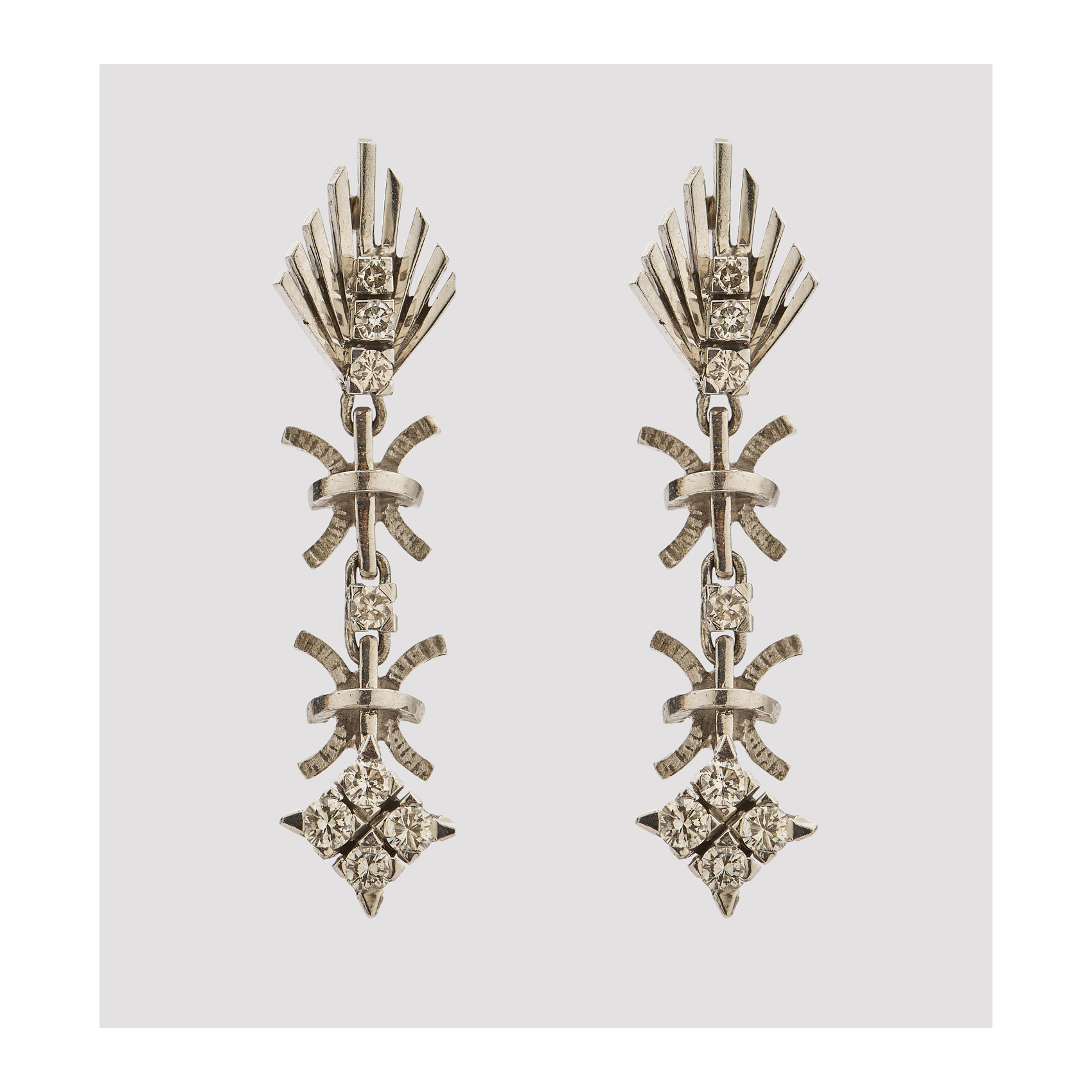 Pendientes largos en oro blanco mate y brillo con diamantes talla brillante engastados en garras.