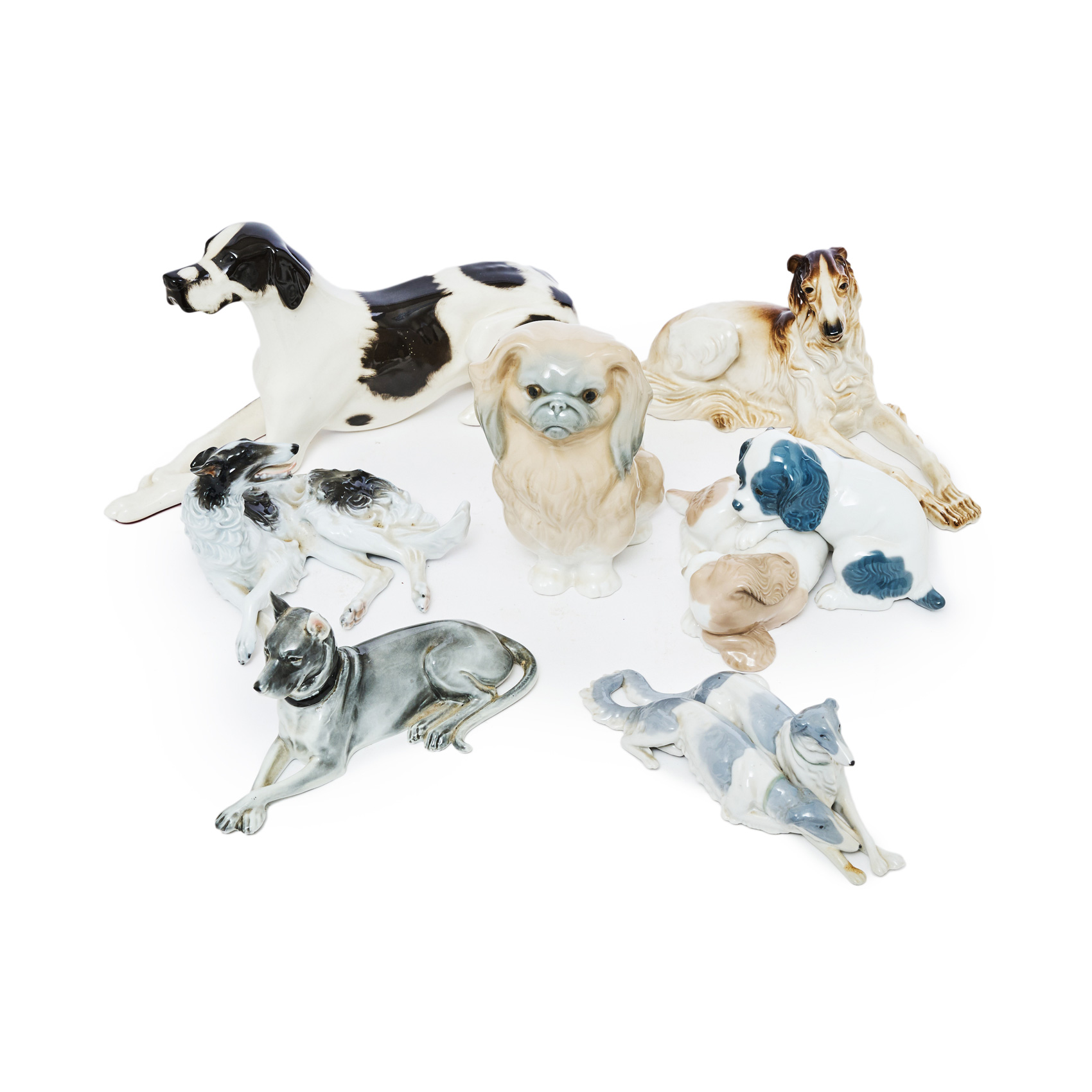 Lote de nueve canes de diferentes razas en porcelana esmaltada de varias manufacturas, s.XX.