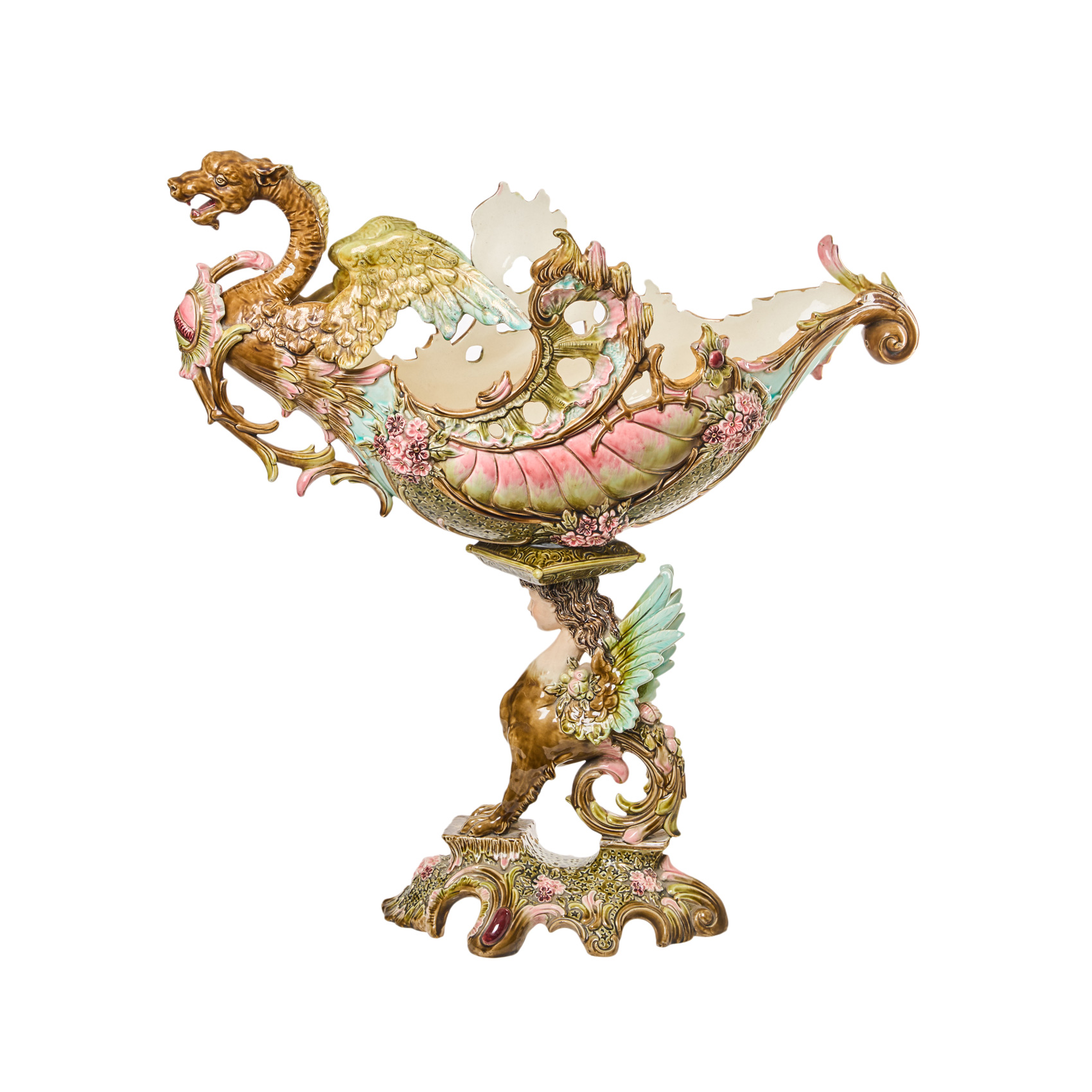 Jardinera en mayólica esmaltada en forma de góndola rematada por grifo y con base en forma de arpía, c.1900.