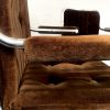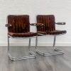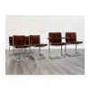 Juego de seis sillas mid-century con doble estructura tubular en acero cromado y tapicería renovada de patrón rayado en terciopelo de tonalidad marrón chocolate. Desenfundables. Se compone de cuatro sillas normales y dos más con reposabrazos.