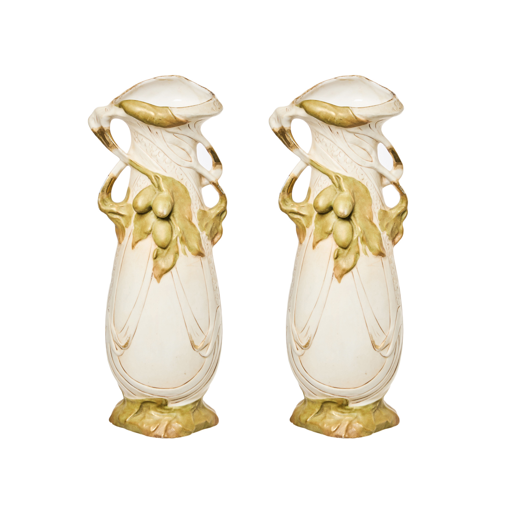 Pareja de jarrones en porcelana checa esmaltada con fileteados al oro fino, c.1900. Marcas en la base.