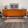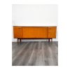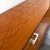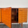 Aparador mid-century en madera de palo rosa con patrón ajedrezado de maderas contrastadas, Francia, c.1960. Frente con parte central de dos puertas, y dos compartimentos laterales con puertas y estantes regulables en su interior. Calzos y tiradores en latón.