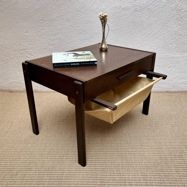 Mesa costurero de diseño danés en madera con cajón en cintura compartimendo al interior y cesta de almacenaje en la parte inferior, c.1960.