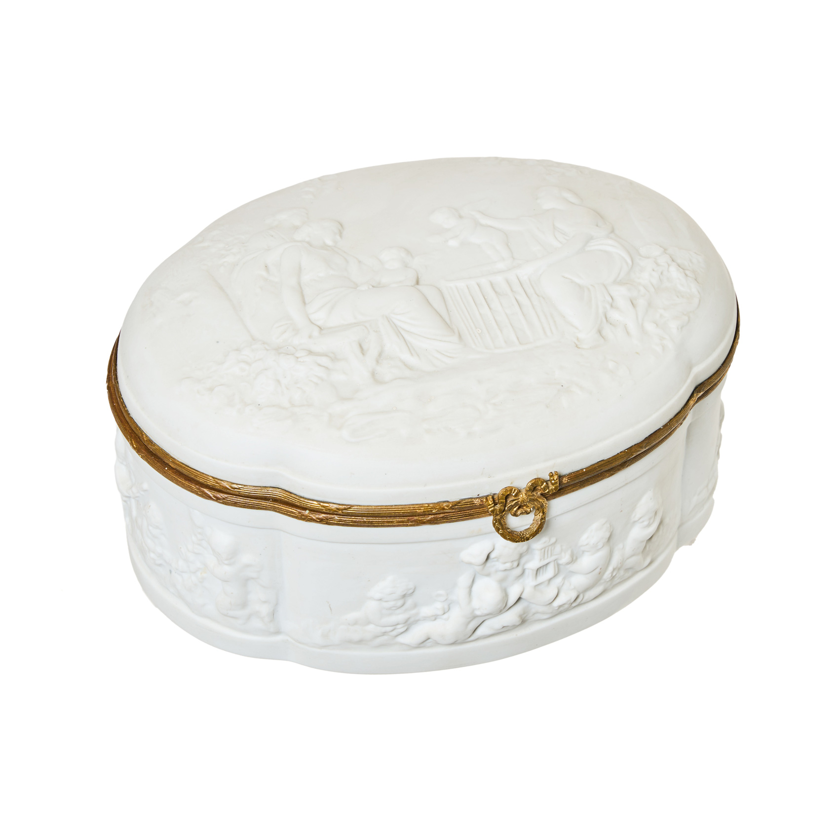 Caja en biscuit blanco francés con decoración de escenas de figuras clásicas con puttis alados en relieve, s.XX. Marcas en la base.