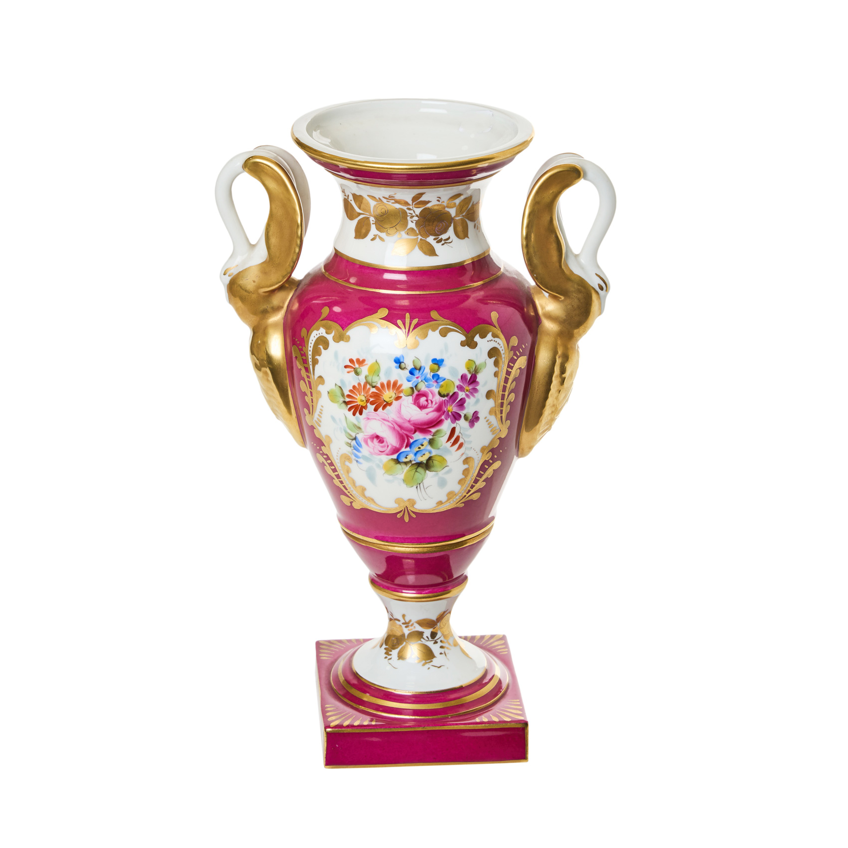 Jarrón con asas de cisnes en porcelana francesa Viejo París de Pillivuyt esmaltada en tonalidad burdeos con motivos florales en carteles y fileteados al oro fino, s.XX. Marcas en la base.