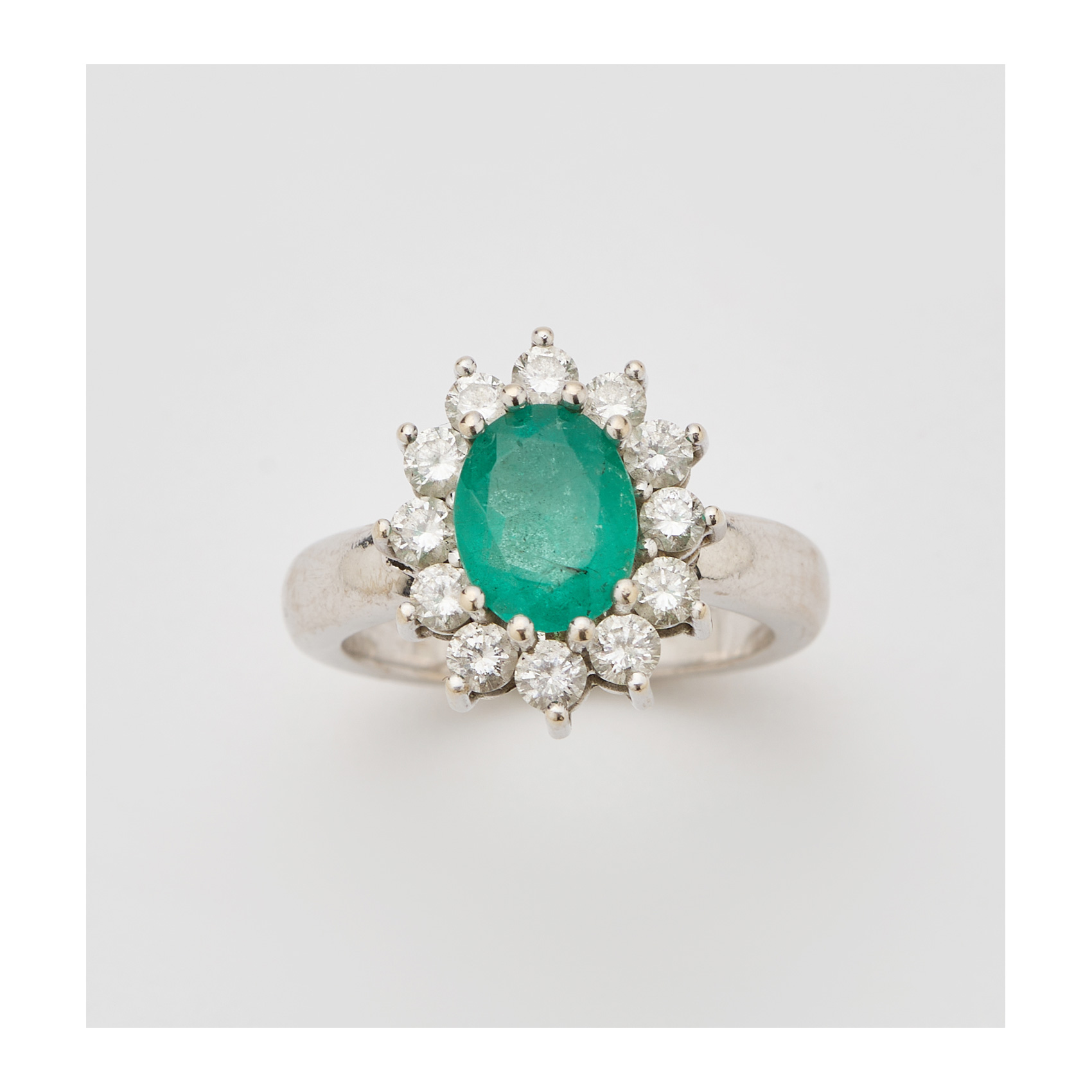 Sortija rosetón en oro blanco con esmeralda talla oval orlada por diamantes talla brillante.