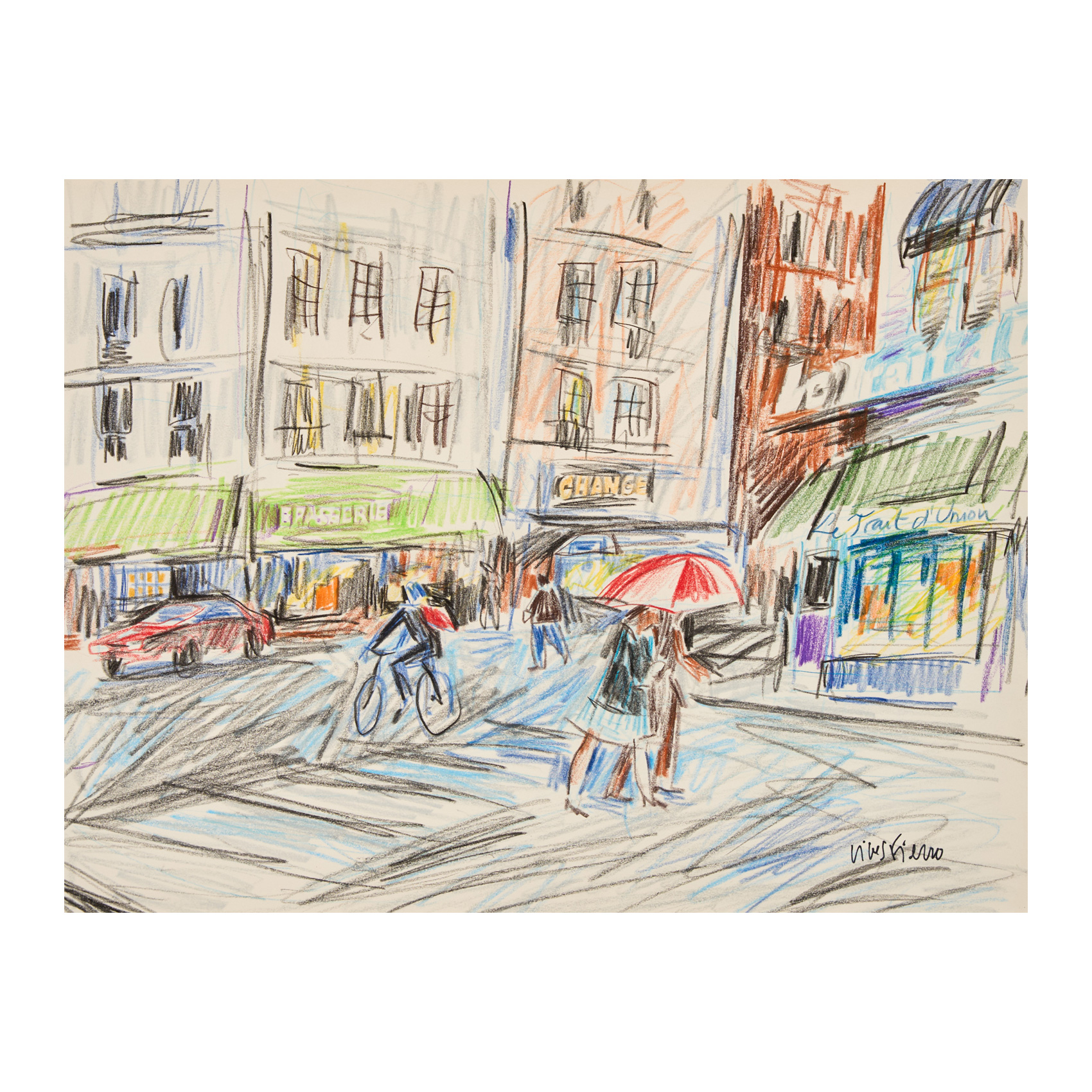 Dibujo a lápices y ceras de color sobre papel. Firmado.