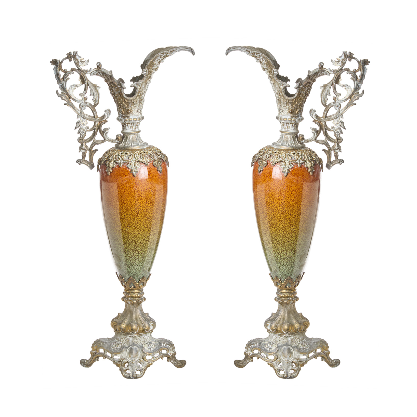 Pareja de jarras estilo renacimiento en porcelana esmaltada con decoración de motivos florales, s.XX. Pie y montura en calamina patinada con decoración calada de motivos vegetales, vides y mascarones.