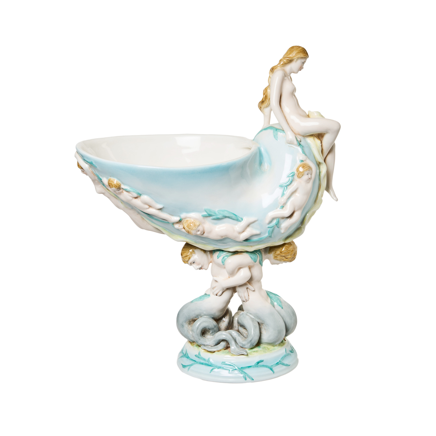 Centro en porcelana danesa esmaltada con representación de concha marina sustentada por tritones y coronada por desnudo femenino, s.XX. Marcas en la base.