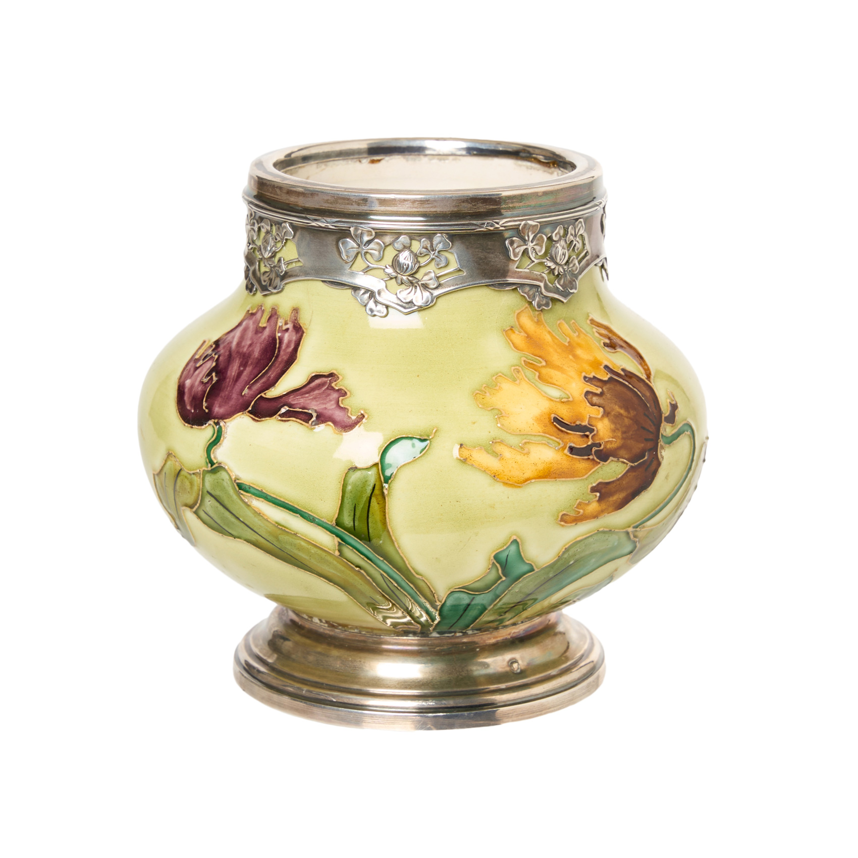 Jarrón en porcelana francesa de Sèvres con decoración esmaltada de motivos florales con boca y pie en plata punzonada, c.1920. Marcas en la base.