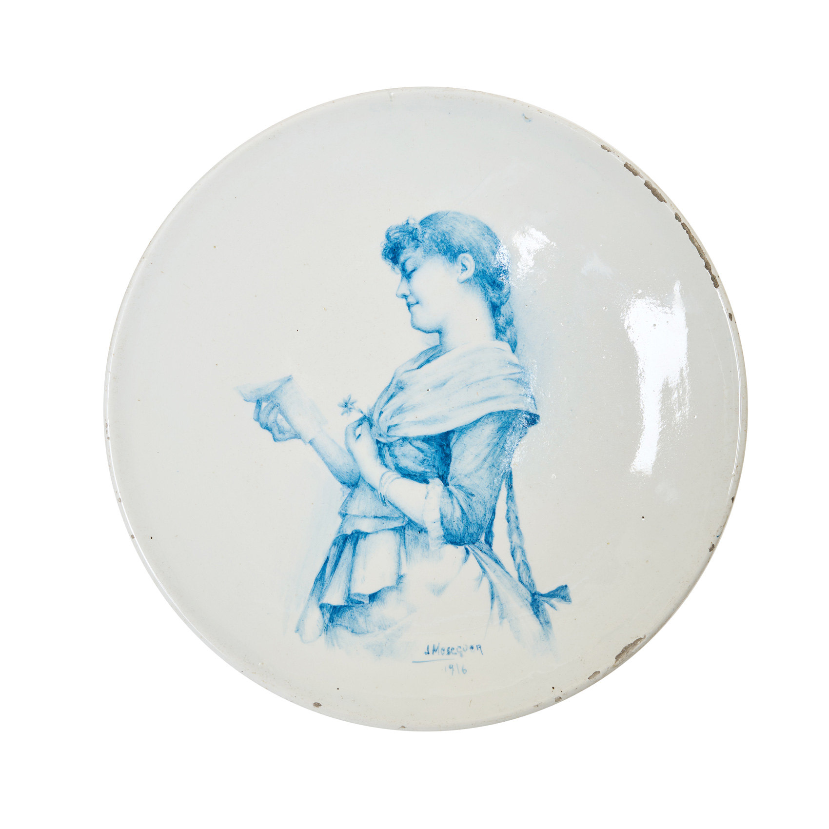 Plato en cerámica esmaltada con representación de joven en tonalidad azul y blanca. Firmado y fechado en 1916.
