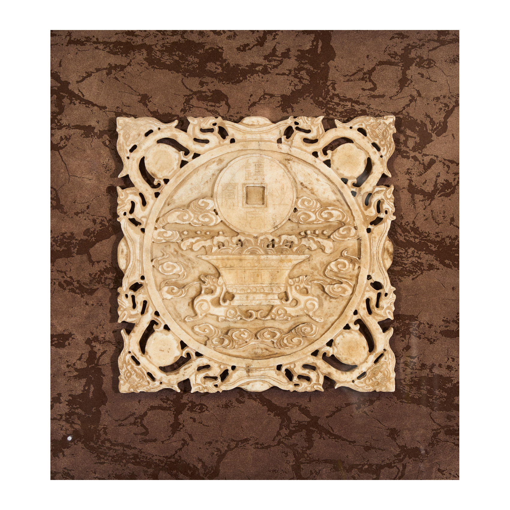 Placa oriental en jadeita blanca tallada con decoraciones de motivos chinescos, ppios. del s.XX. Enmarcado.