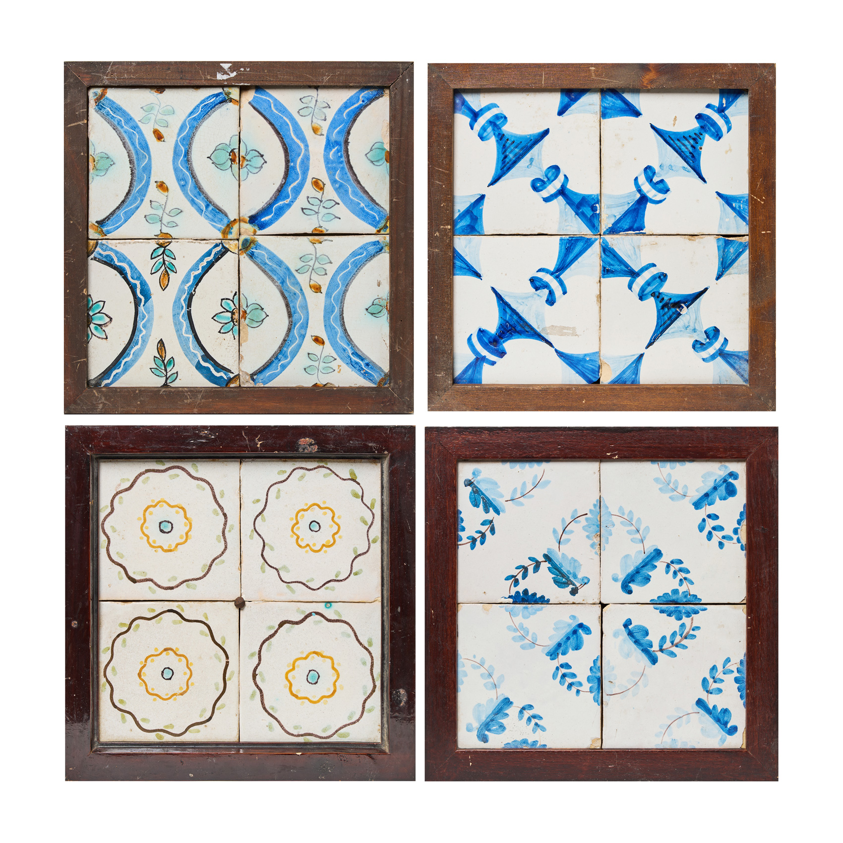 Lote de cuatro plafones de azulejos esmaltados con decoraciones de motivos geométricos y florales, s.XIX.