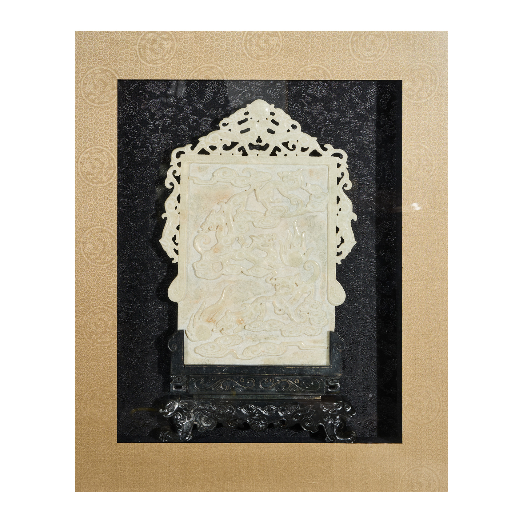 Tondo oriental en jadeita blanca tallada con decoraciones chinescas de nubes y dragones sobre peana en jade negro, ppios. del s.XX. Enmarcado.