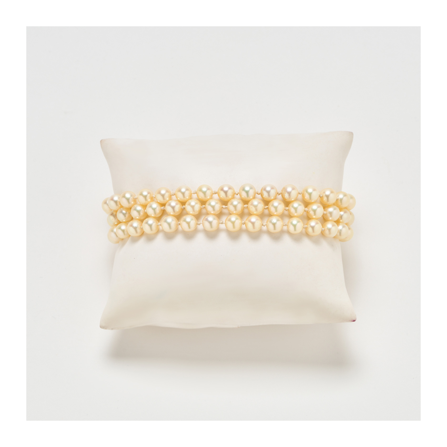 Pulsera de tres tiras de perlas cultivadas de 6 mm. con cierre en oro blanco mate y brillo y tres zafiros azules talla redonda engastados en garras.