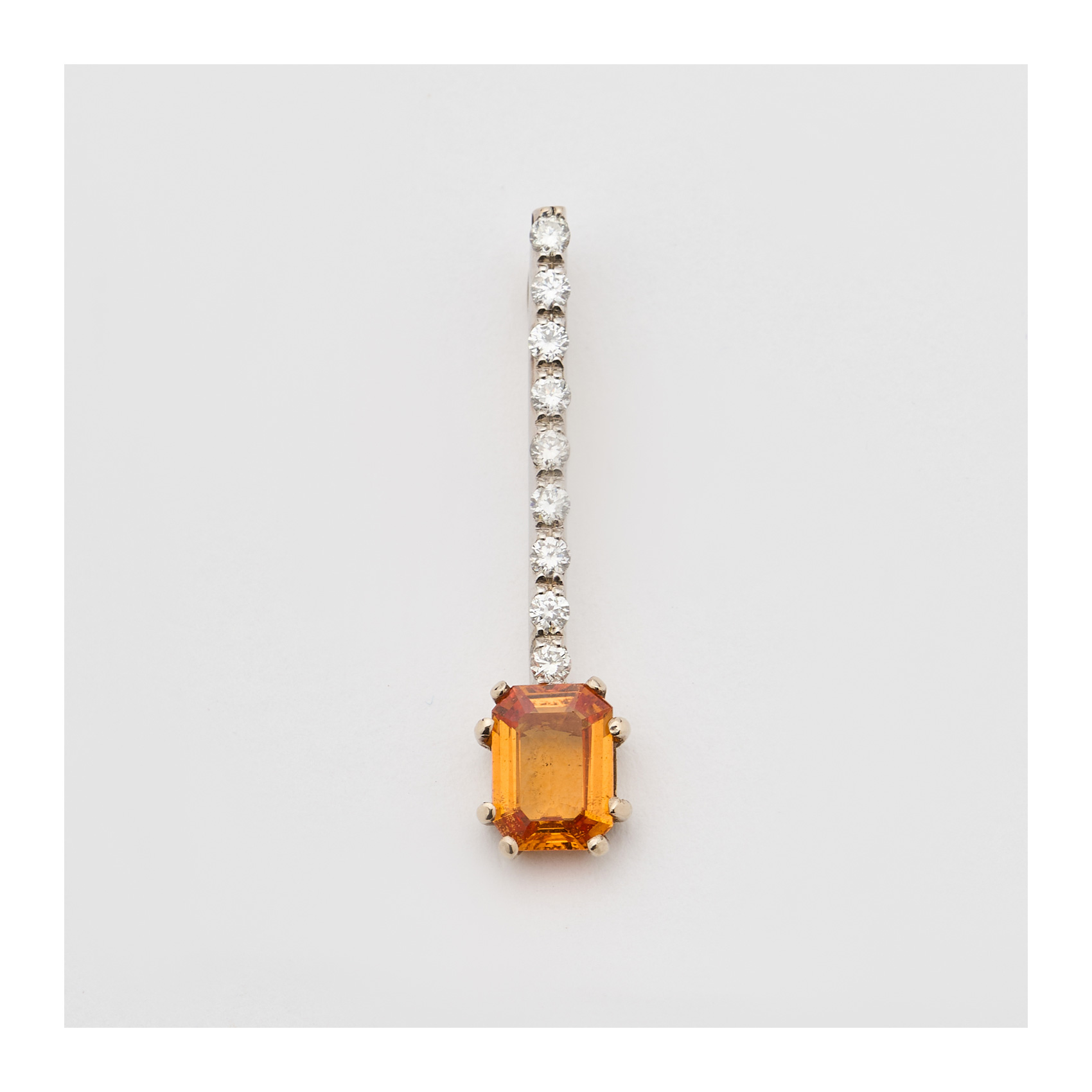 Colgante en oro blanco con barrita de diamantes talla brillante engastados en garras y rematada por un zafiro naranja talla octogonal de 7 x 5 mm, 3 cm.