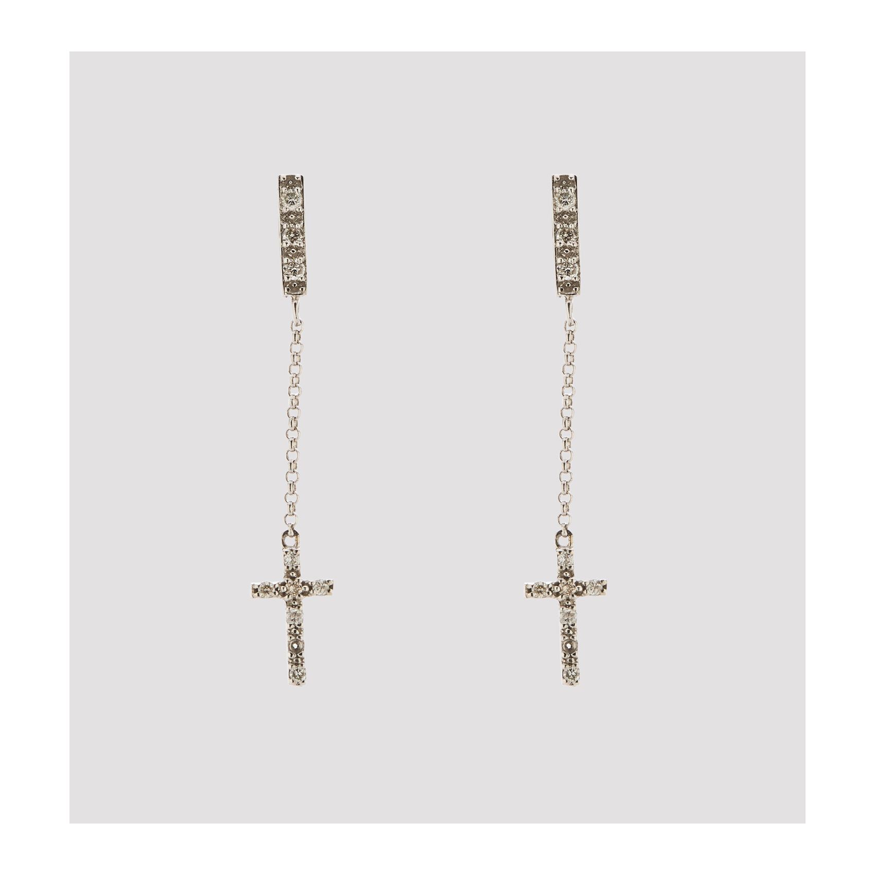 Pendientes en oro blanco con cruz y barrita de diamantes talla brillante unidas por cadenita forjada.