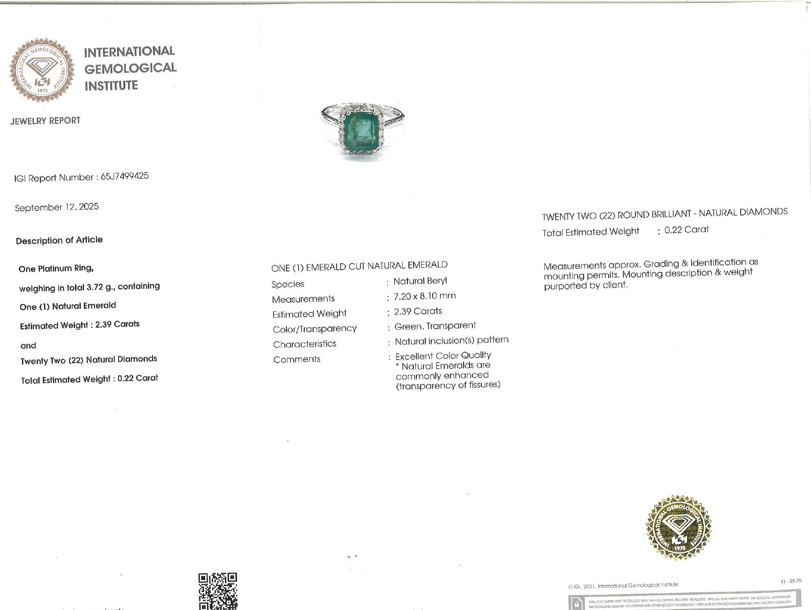 Peso esmeralda: 2,39 ct. aprox.