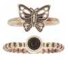 Dos sortijas en plata diseños mariposa calada con circonitas y cabujón de ónix engastado en chatón. Medida: Nº 12. Estimación: 120 – 150 €.