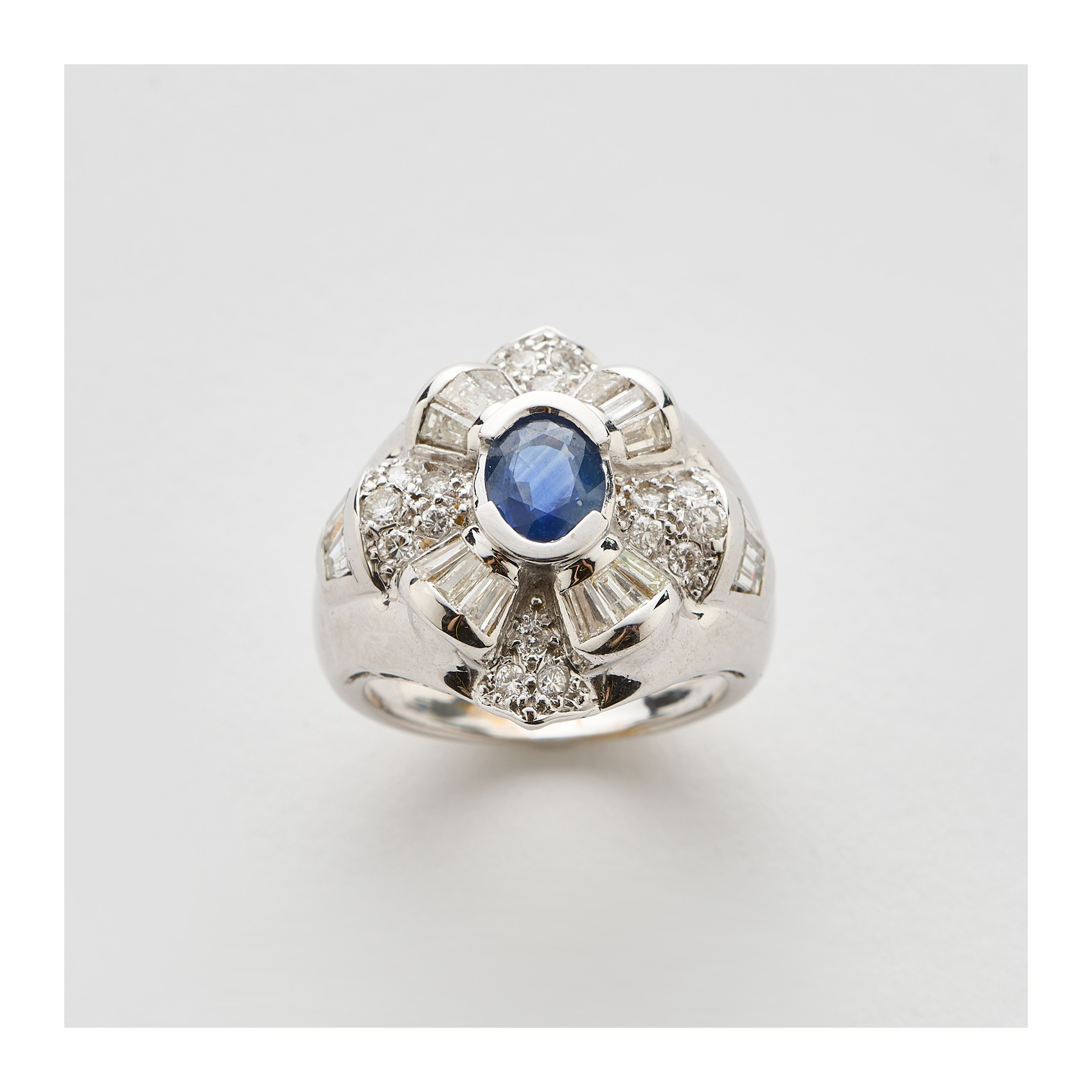 Sortija en oro blanco con zafiro azul talla oval y diamantes tallas brillante y trapecio.