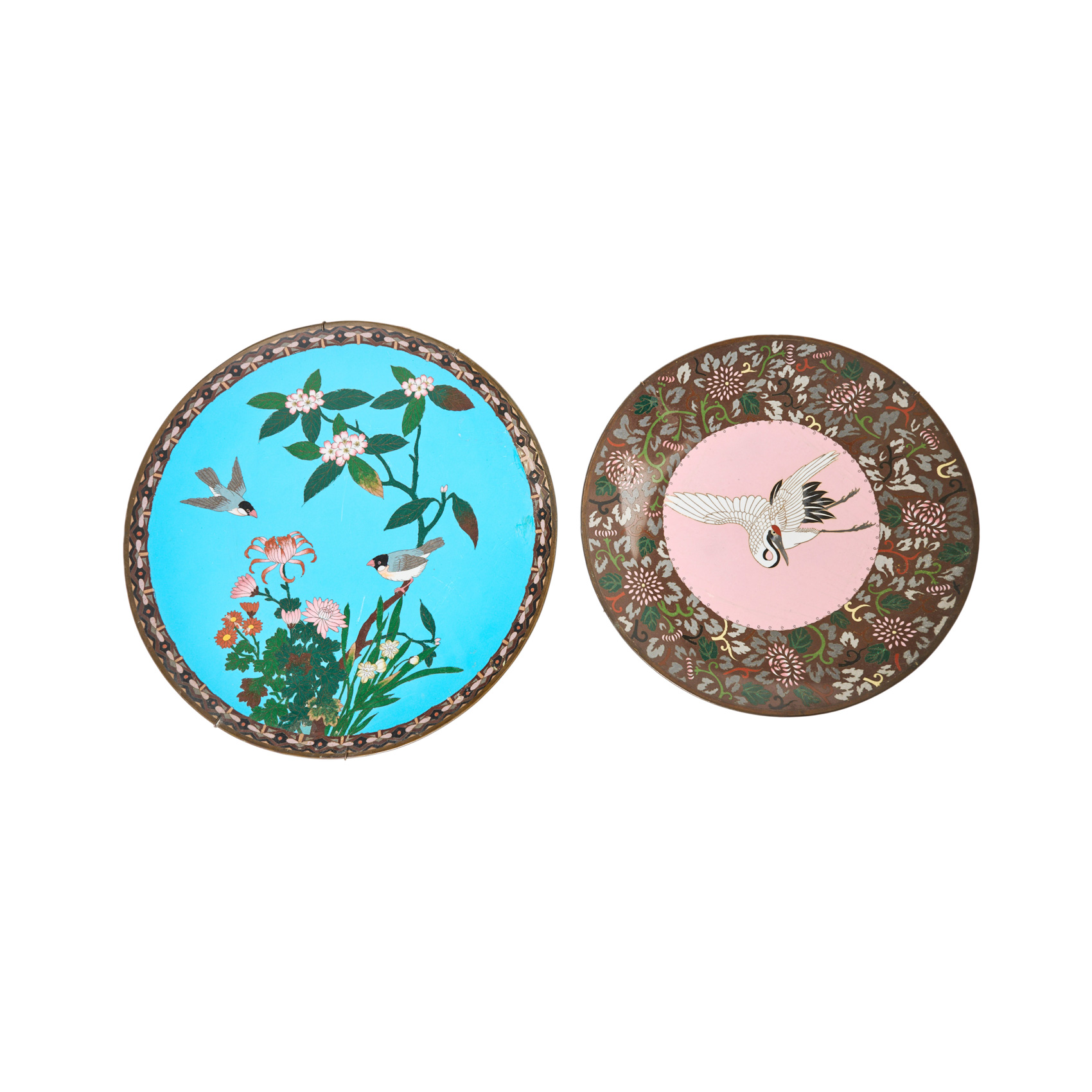 Pareja de platos orientales en esmalte cloisonné decorados por motivos florales y de aves, s.XX.