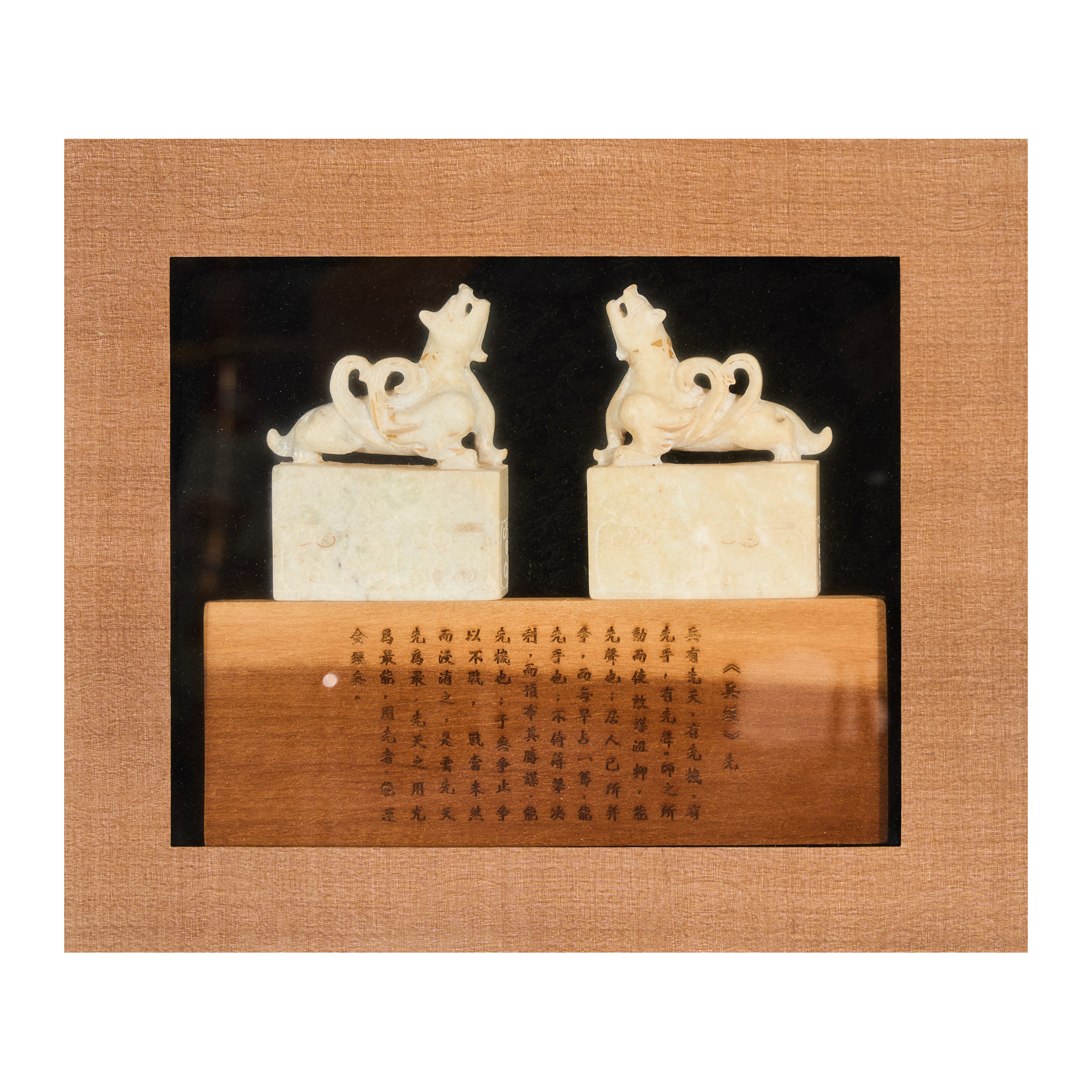 Pareja de furias talladas en jadeita blanca sobre peana en jadeita y base en madera con inscripción en caracteres chinos de un fragmento del Arte de la Guerra de Sun Tzu, ppios. del s.XX. Enmarcado.