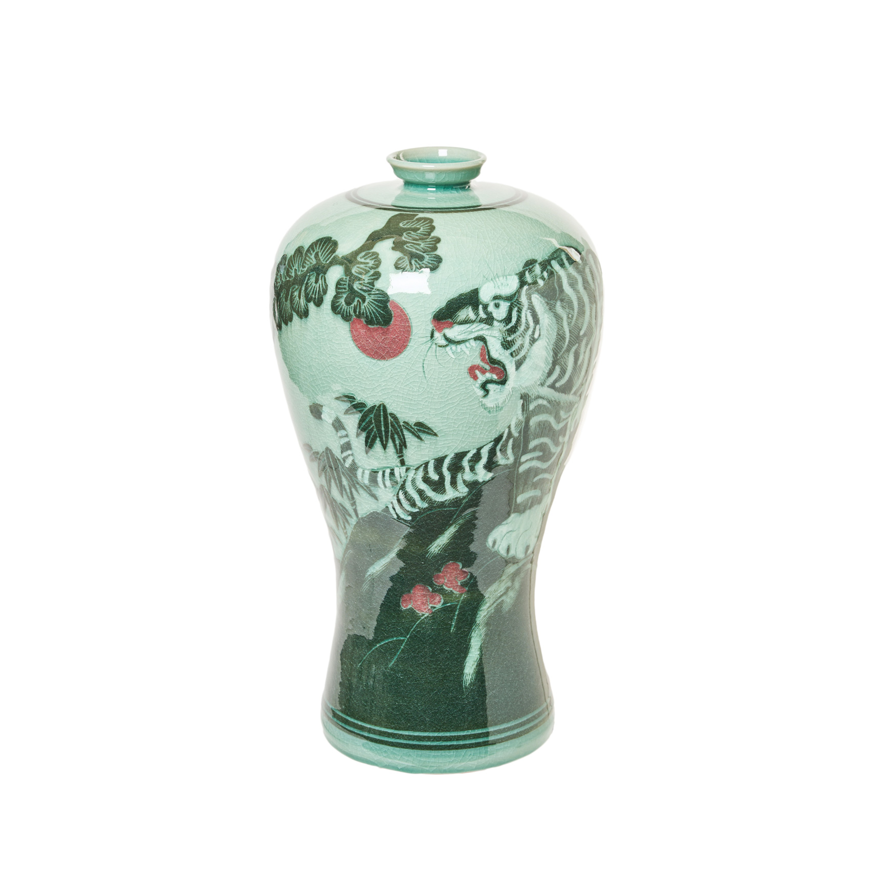 Jarrón coreano en cerámica de Celadón decorado por paisaje con tigre, s.XX. Presenta sello en la base.