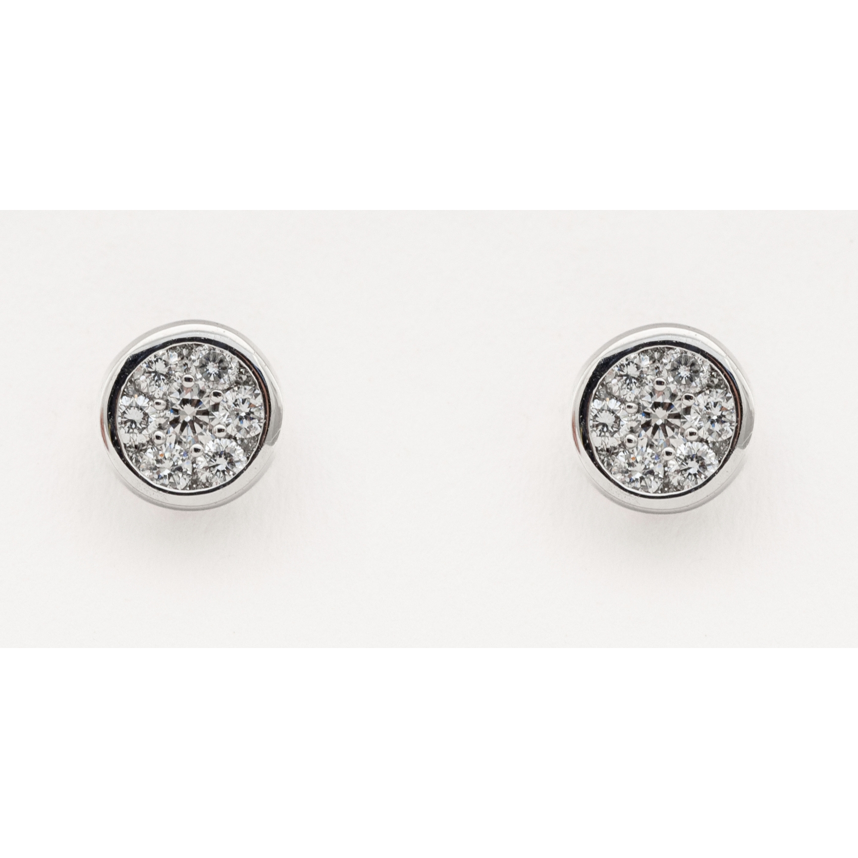 Pendientes rosetón en oro blanco con diamantes talla brillante.