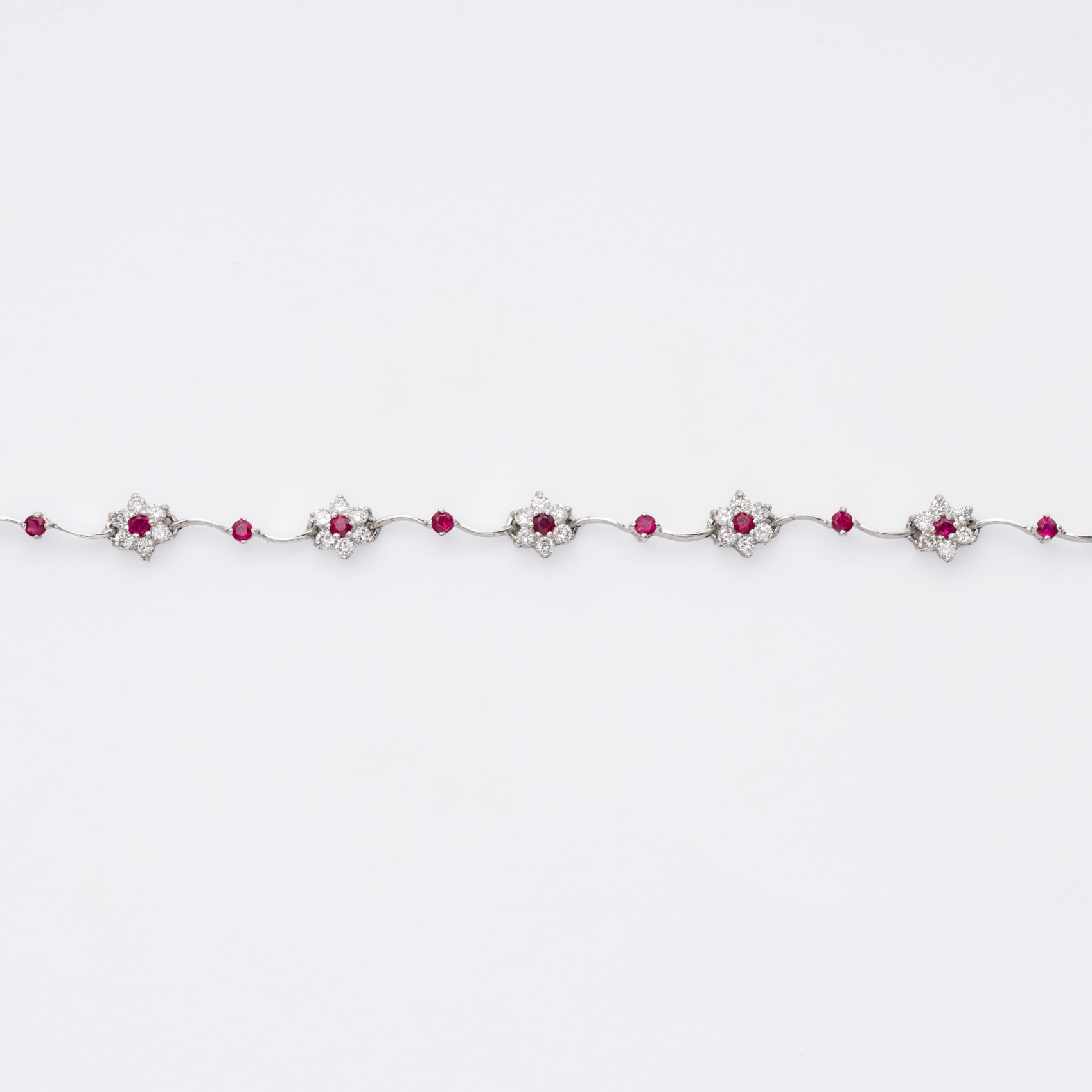 Pulsera en oro blanco con rosetones y barritas onduladas de diamantes talla brillante y rubíes talla redonda engastados en garras.