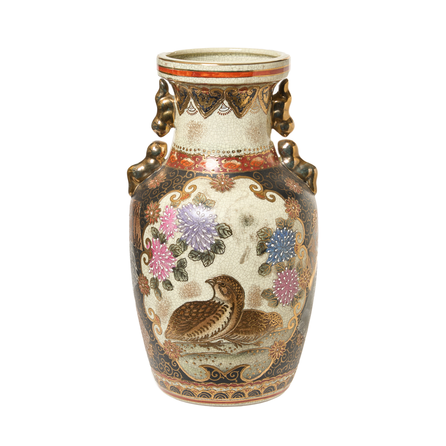 Jarrón en porcelana esmaltada y dorada, siguiendo modelos de la Era Meiji (s.XIX). Con decoraciones en relieve y representaciones de flores y aves, s.XX. Adjunta certificado de reproducción.