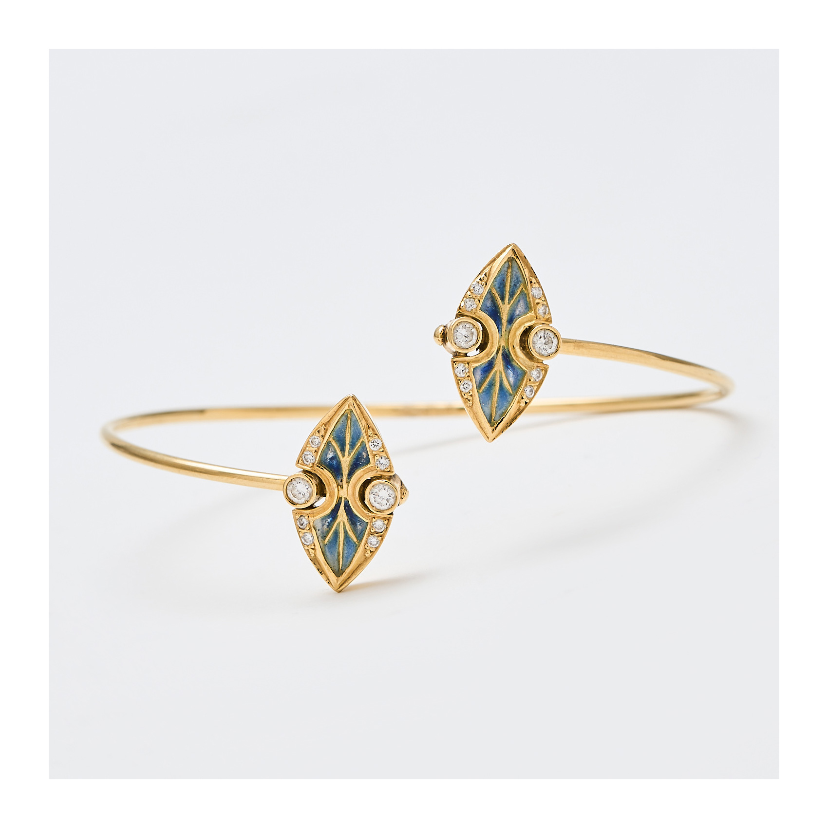 Pulsera esclava diseño abierto en oro con extremos rematados por motivos ojivales en esmalte y diamantes talla brillante.