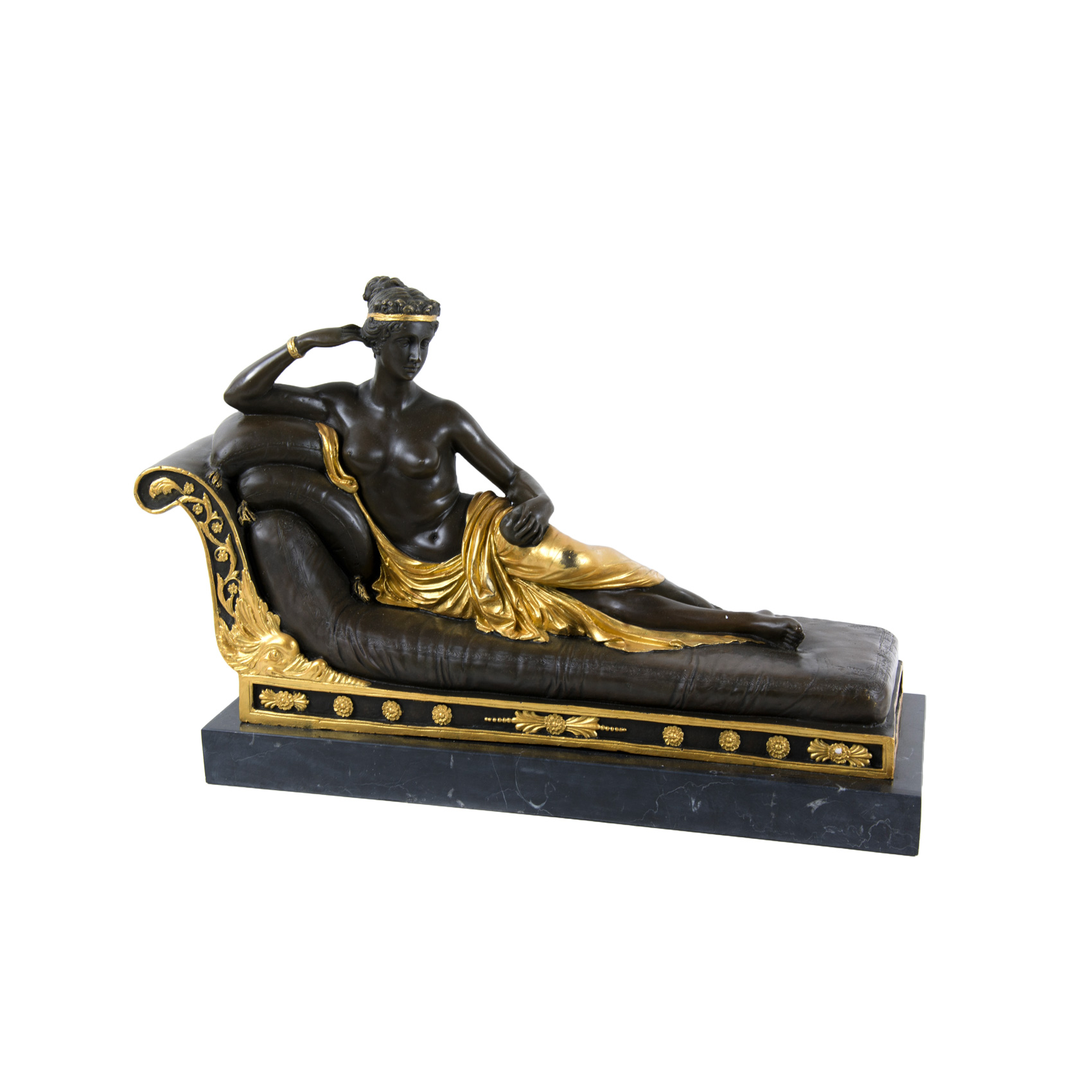 Escultura en bronce patinado y dorado sobre peana en mármol negro veteado. Firmada.