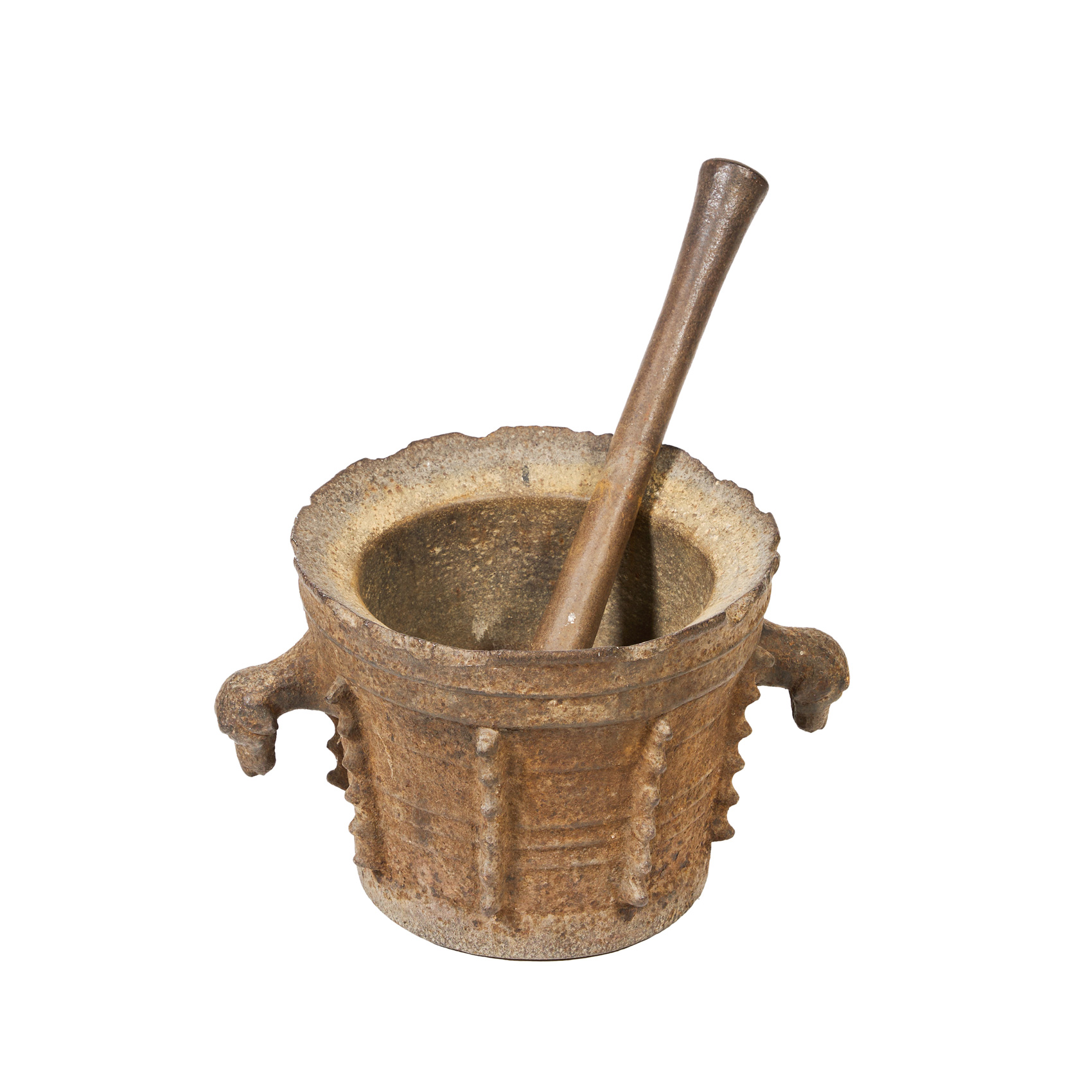 Gran mortero de farmacia con pistilo en hierro fundido de forma tronconónida invertida, cuerpo de costillas y mangos en forma de cabeza de león, fles. del s.XVI-ppios. del s.XVII.