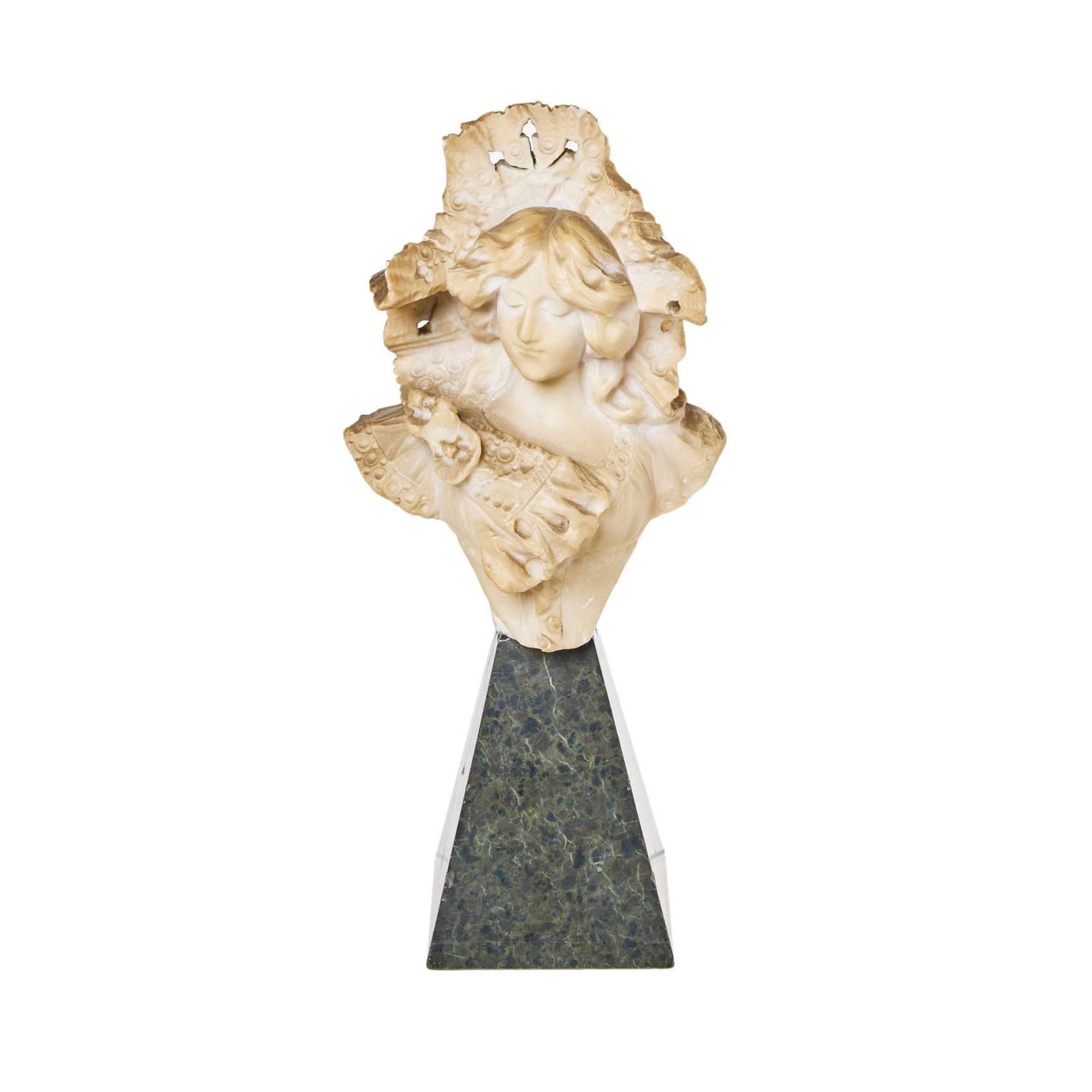 Escultura en alabastro sobre peana cónica en mármol verde.