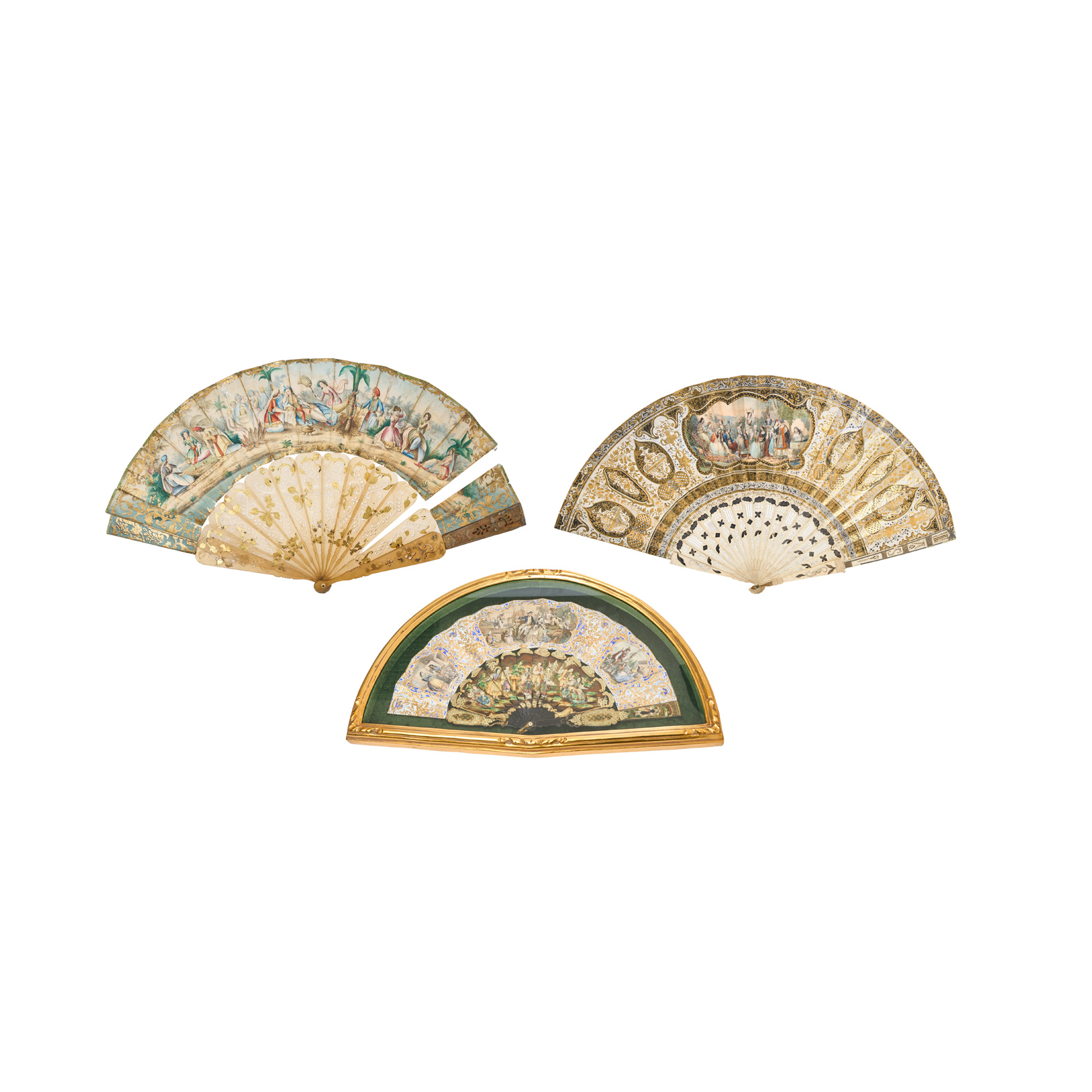 Lote de tres abanicos isabelinos, s.XIX. Uno con país en papel con decoración bucólico campestre pintada al gouache y varillaje en resina con decoraciones doradas de motivos vegetales. Uno con país en papel con escena bucólico campestre pintada al gouache y grabados en dorado con varillaje en hueso. Y otro enmarcado con país en papel con decoración de escenas bucólico campestres pintadas al gouache con varillaje en madera lacada con incrustaciones en nácar y clavijo en hueso, s.XIX.