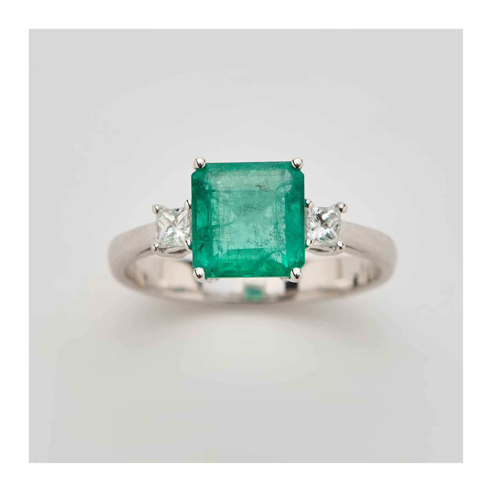 Sortija en oro blanco con esmeralda talla carré custodiada por diamantes talla princesa.